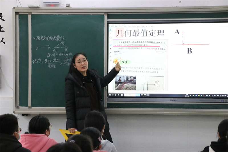 合肥46中邹太芹老师与六安九中胡相辉老师分别上了中考复习课《几何最值问题》。邹老师的课深入浅出,知识体系完整,对本节课教学的重点进行了详细的讲解,化繁为简,环环相扣,逐步深入;胡老师的课,对问题探究专一深透,巧妙回顾本科知识点,调动了学生学习积极性。在两位老师的引领下,各种数字、字母、符号、公式、图形,变换、组合、碰撞,弹出数学之美的协奏曲。