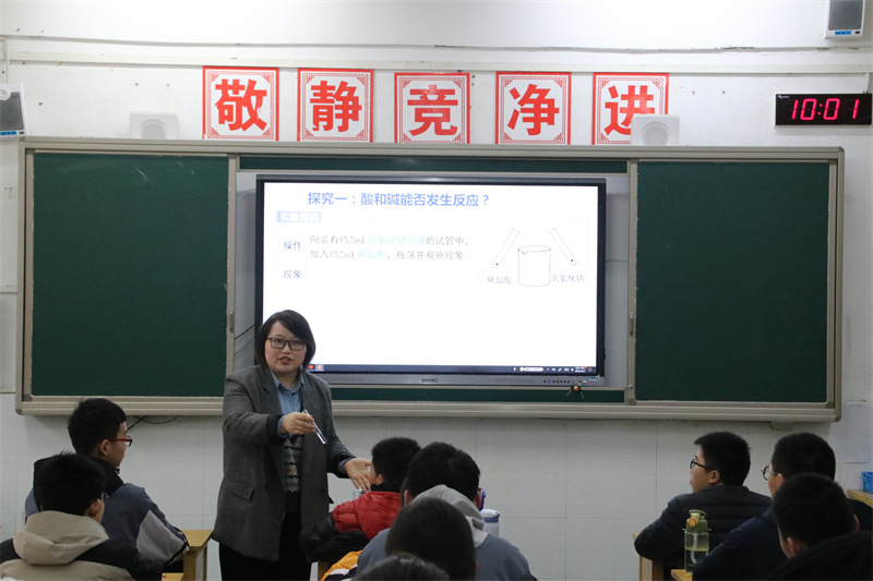 合肥46中黄也明老师和六安九中的田小雨老师就《酸和碱的中和反应》上了两节公开展示课。黄老师根据目标,结合学情和教学内容对本节课教学重点、难点进行了详细地讲解,化繁为简,环环相扣,逐步深入;田老师以思维导图展示知识,巧妙地将本科知识点回顾,并及时联系生活实际,调动学习积极性,激发学生学习兴趣。