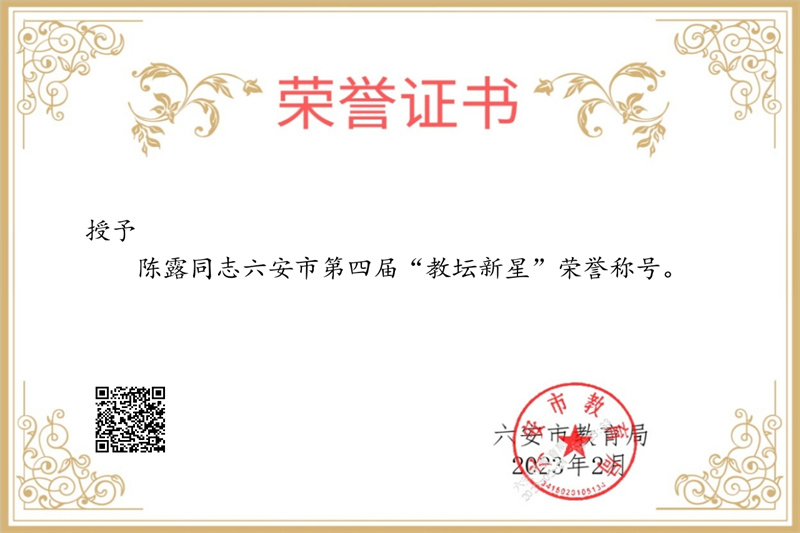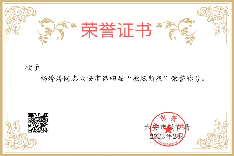 教坛辈有才人出,新星熠熠展风采。近日,六安市第四届“教坛新星”遴选活动结果揭晓,我校程学芳、何叶、胡克云、陈露、杨婷婷、邹葳、黄道菊、姜时凤、丁美月九位老师“摘星”成功,荣获六安市第四届“教坛新星”荣誉称号。其中,程学芳、何叶、胡克云三位老师拟推荐为安徽省第四届“教坛新星”遴选人员。