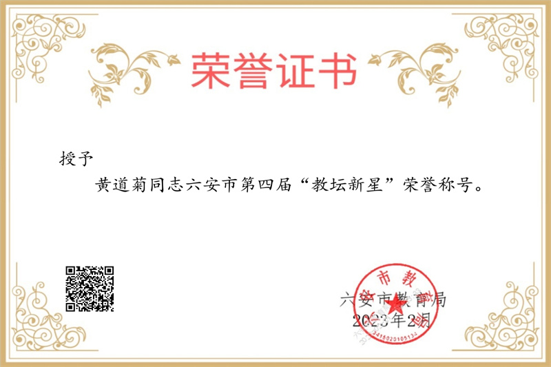 黄道菊老师 大学本科,中学一级教师,中共党员,六安市第四届教坛新星,裕安区师德先进个人,裕安区优秀班主任,曾荣获六安市智慧课堂优质课大赛一等奖、安徽省青年教师教学大赛市一等奖、六安市信息化大赛二等奖,多次获裕安区教学成果奖,多次获一师一优课市级优课、省级优课奖。