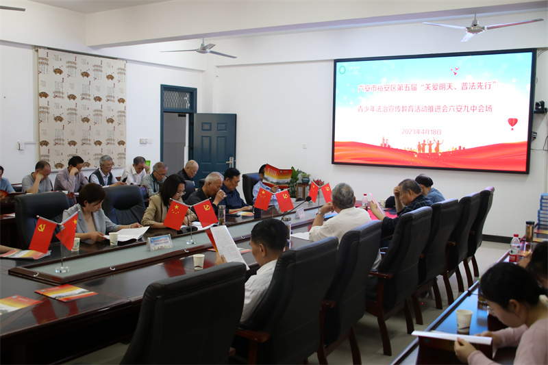 在学校接待室,大家一起热情座谈。座谈会上,李艳代表学校欢迎各位领导的莅临指导,感谢各位领导一直以来对学校的真诚关心和真情指导,并做了以“法治宣传教育,培根铸魂育人”为主题的汇报发言。六安九中始终坚持把法治宣传教育作为学校青少年成长工作的重要内容,按照“政府引导、社会参与、家庭互动、学校为主”四位一体的法治宣传教育模式,通过打造“三支”队伍:思政教师队伍、“五老”队伍、小小宣传员队伍;突出“四个”围绕:围绕普法氛围营造、围绕红色基因赓续、围绕普法实践活动、围绕文明礼仪教育;依托“三个”载体:法治戏曲、法治长廊、专题讲座,不断深化法治宣传教育,培根铸魂育新人,落实了立德树人的根本任务,践行着“为党育人、为国育才”的教育使命,培养了一批全面发展、堪当大任的时代新人。学校第五届“关爱明天、普法先行”青少年法治宣传教育活动已于去年9月份全面启动,目前正在逐步深入地开展各项工作。