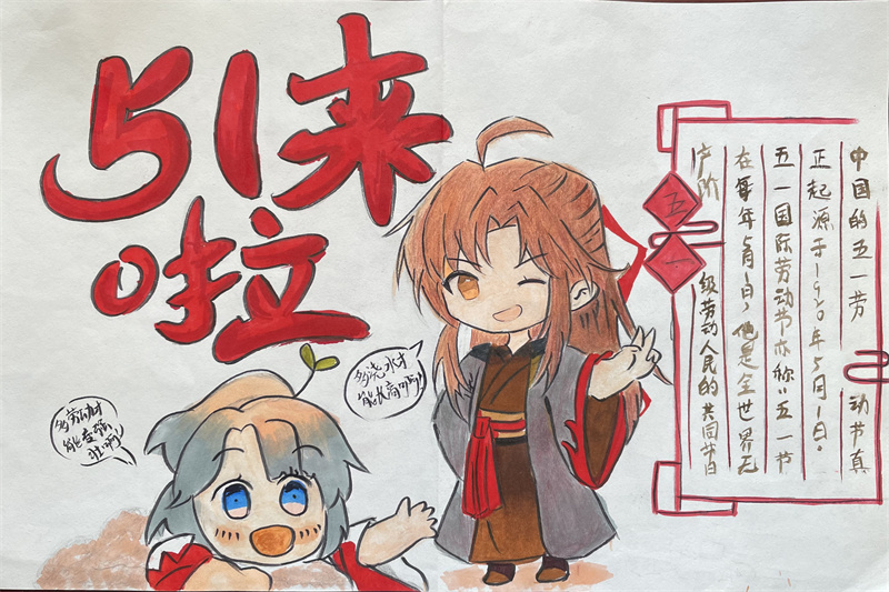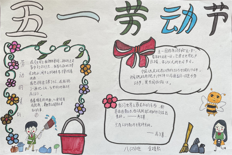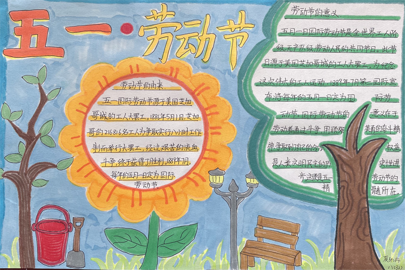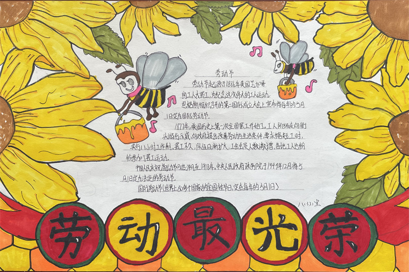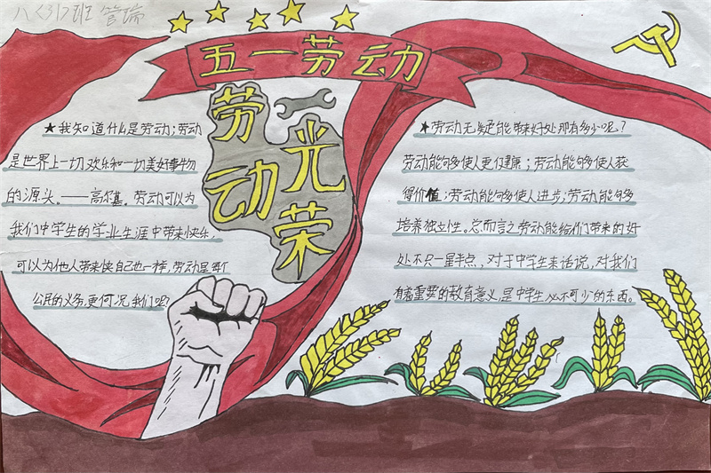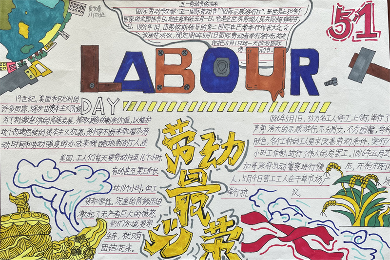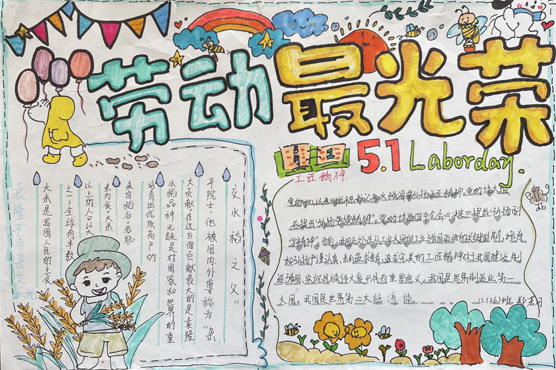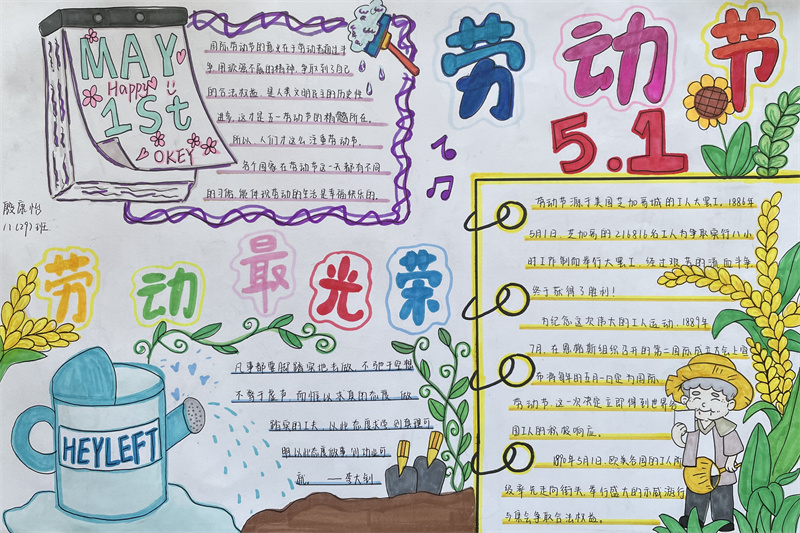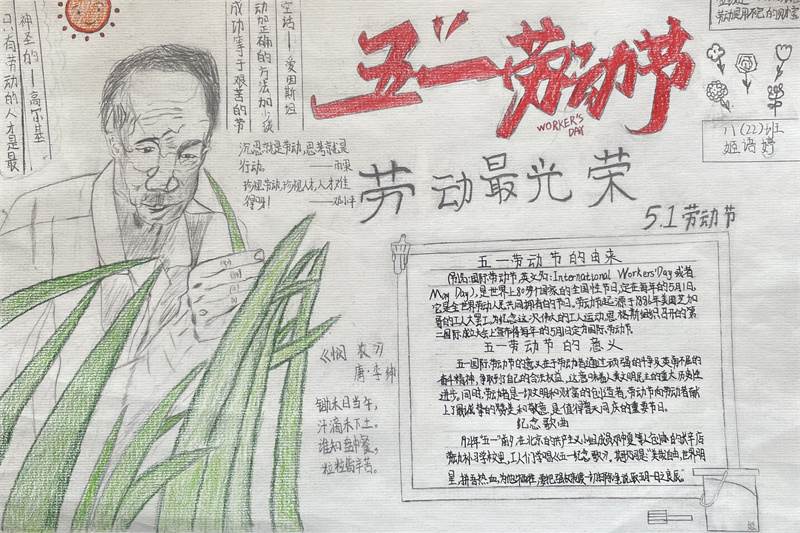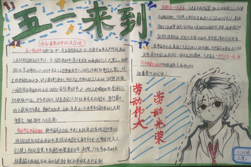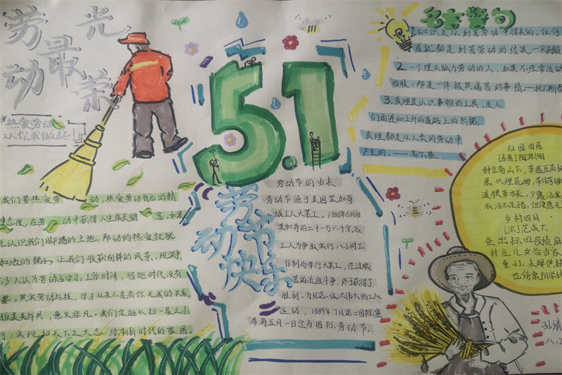 学校组织各班开展了“爱劳动,迎五一”手抄报活动,各位班主任安排布置,精心指导,同学们积极参与,搜集素材,设计版面。通过鲜艳的色彩搭配,生动的语言文字,灵动的插图等表达自己对劳动的理解,对广大劳动者的赞美与讴歌。