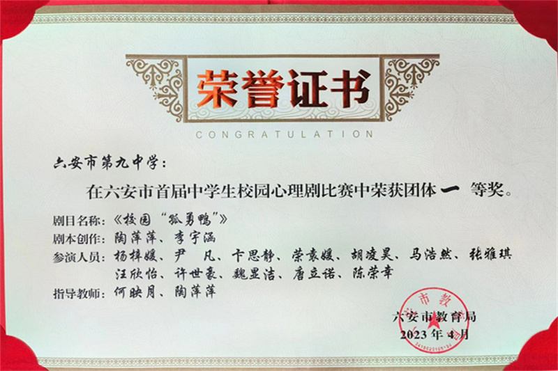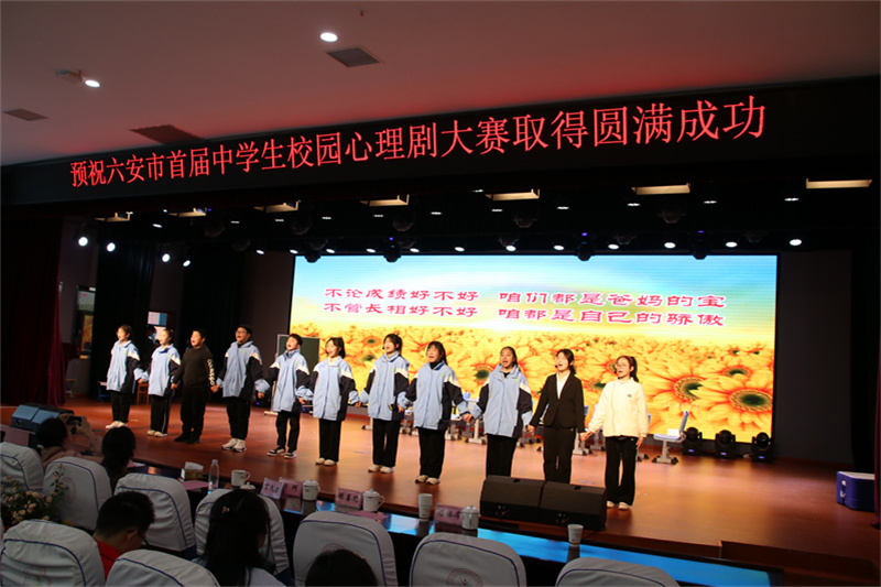 4月4日,六安市首届中学生校园心理剧大赛在六安市青少年综合实践基地举行。我校原创剧目《校园“孤勇鸭”》以93.40分的优异成绩在大赛中夺得第一名。