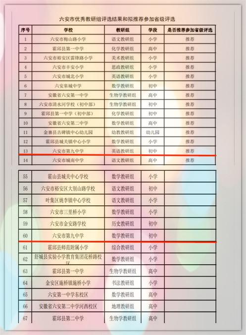 青春沃野砥砺耕,“研”途花开芳菲灼。近日,根据《六安市教育局关于开展全市中小学、幼儿园教研先进单位、优秀教研组、优秀教研员评选的通知》(六教研〔2023〕4号)文件精神,经学校遴选推荐,市级专家组织评审,我校英语教研组、数学教研组被评为六安市优秀教研组,其中,英语教研组拟推荐参加省级评选。