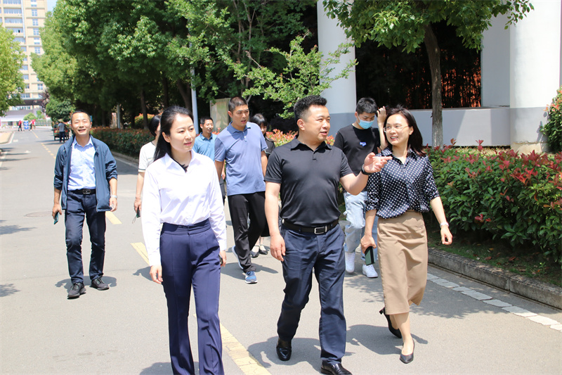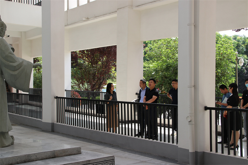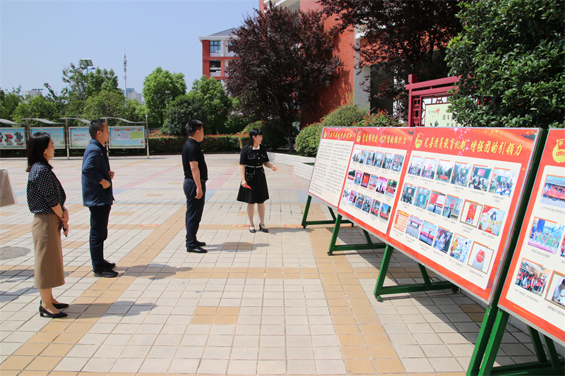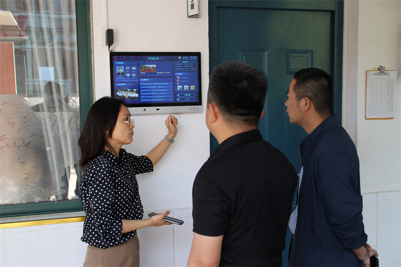 调研组一行在学校讲解员的引领下,实地察看了学校布局、校园环境和学生活动场所。在团建展板前,调研组一行驻足观看,在聆听介绍、询问细节后,充分肯定学校团、队工作形式新颖、措施得力、富有特色、成效显著;在学校大厅,醒目的“九中梦”、独具匠心的“书山”“学海”雕塑、学校发展浮雕、红色文化墙等展现学校教育特色和文化底蕴的内容,深深地吸引着调研组一行;在深入了解了班级智慧班牌的功能和操作后,调研组一行饶有兴趣地现场操作,称赞智慧班牌为学校管理、家校畅联、班级文化提供了极大地便利,真正提升了学校智慧化水平;在参观了学校艺体馆后,调研组一行盛赞学校社团活动开展得多样精彩,社团软硬件设施齐全。