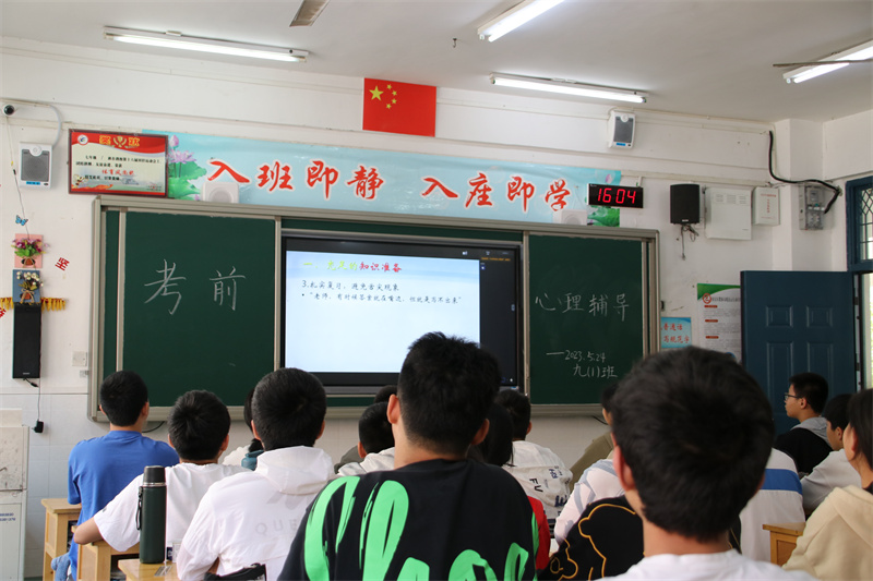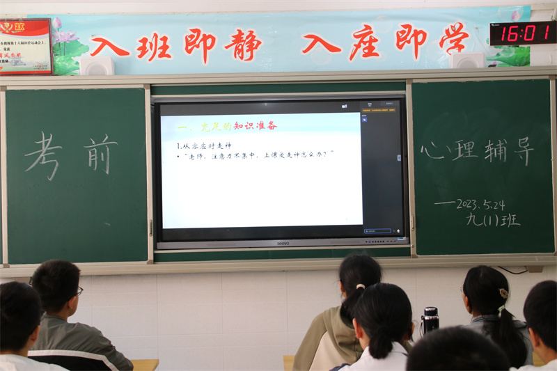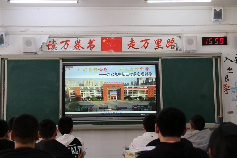 孟夏草木长,校园树扶疏,经过三年的辛勤栽培,初三学生即将迎来收获的时节。为指导我校毕业班学生科学平稳备考,以最佳的心理状态走向中考考场,5月24日下午,六安九中开展了以“把握良好心态,从容应对中考”为主题的考前心理辅导讲座,全体毕业班学生在各班教室观看了直播课。讲座由我校国级二级心理咨询师、心理健康教育中心的冯文娟老师担任主讲。