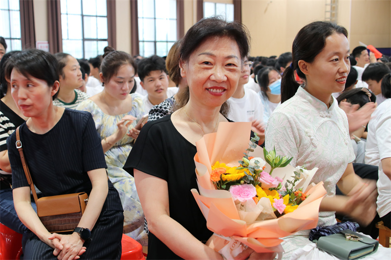 和着悠扬的旋律,32位毕业班班主任缓缓走向舞台中央,激情齐唱《祝你一路顺风》,惊艳全场,为即将远行的志笃少年送上最诚挚的祝福,将现场气氛推向高潮。学生代表向老师们深情献花,感念师恩。最美的花,承载着最深的情,所有的不舍、感激、祝福、憧憬和期盼都定格在了这一美好的瞬间。