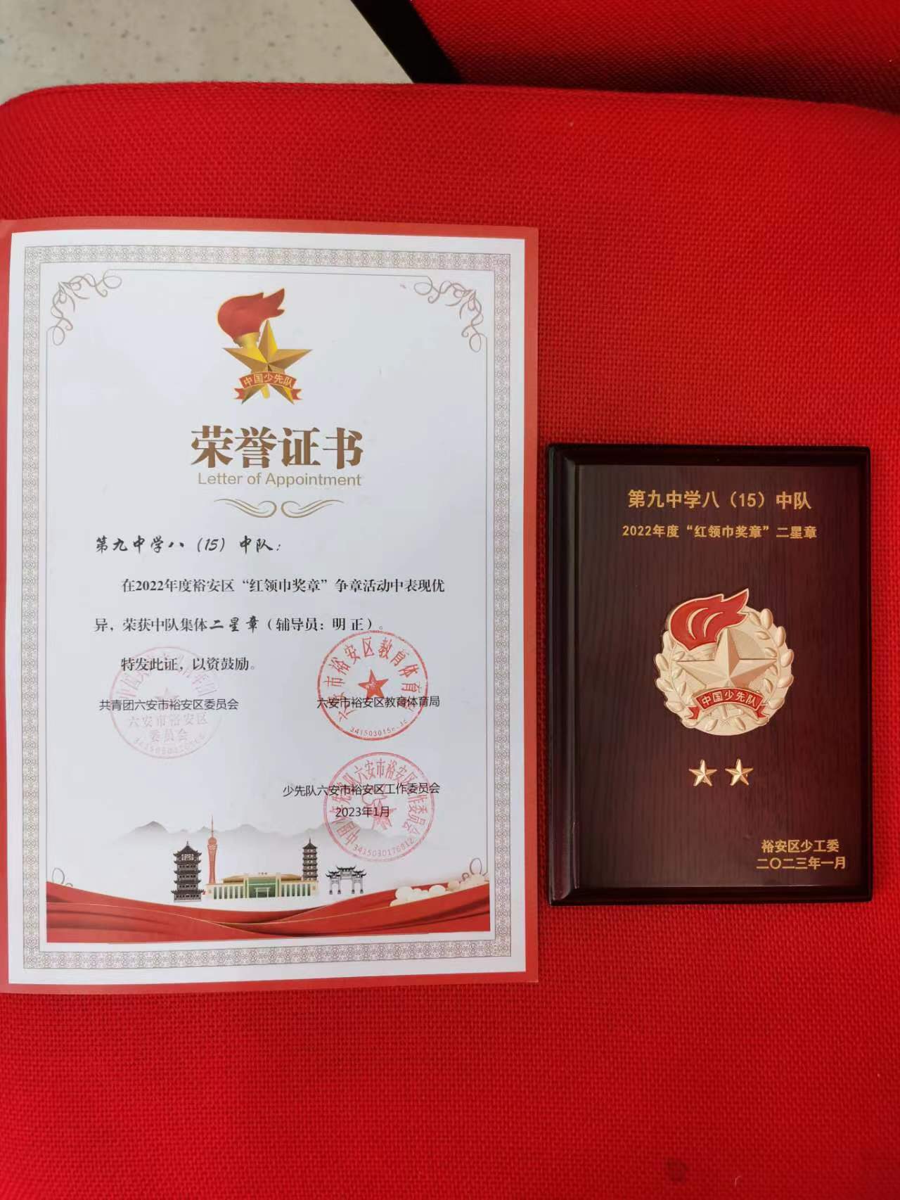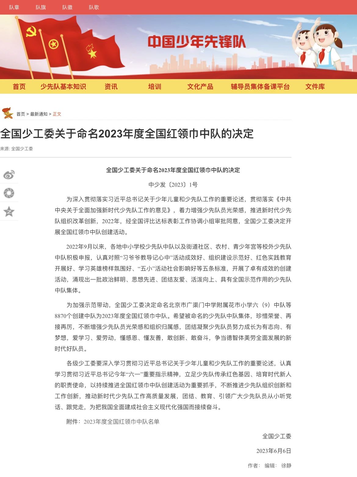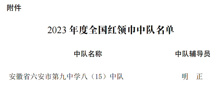 近日,全国少工委下发《关于命名2023年度全国红领巾中队的决定》(中少发【2023】1号),六安九中八(15)中队荣获“全国红领巾中队”称号。