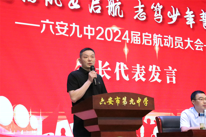 家校携手齐合力,同舟共济扬帆起。2024届九(32)班马馨悦同学家长、六安二中教师马原林代表全体家长发言,他高度赞誉了六安九中高品质的教育和高质量的发展,表达了对学校的感激之情,倾诉了父母对孩子的殷切期盼。