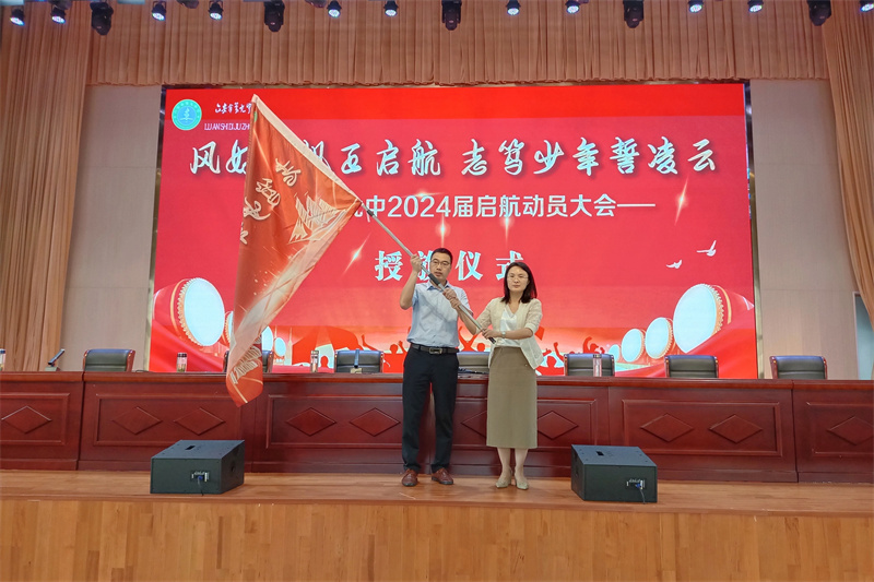 授旗担使命,整装再出发。在大家的共同见证下,六安九中校长李艳庄重地将承载着责任与荣光的战旗交到九年级年级部主任梁中兵手中。授予战旗,授予的是期望和激励;接过战旗,接过的是责任和信心。手握长缨,不可阻挡,2024届全体师生将携凌云之志,共赴中考之战。