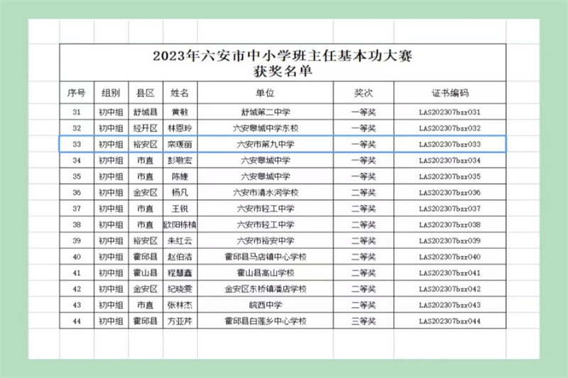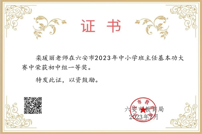 奋进结硕果,捷报传佳音。近日,2023年六安市中小学班主任基本功大赛落下帷幕,我校栾瑗丽老师喜获班主任基本功大赛初中组一等奖。