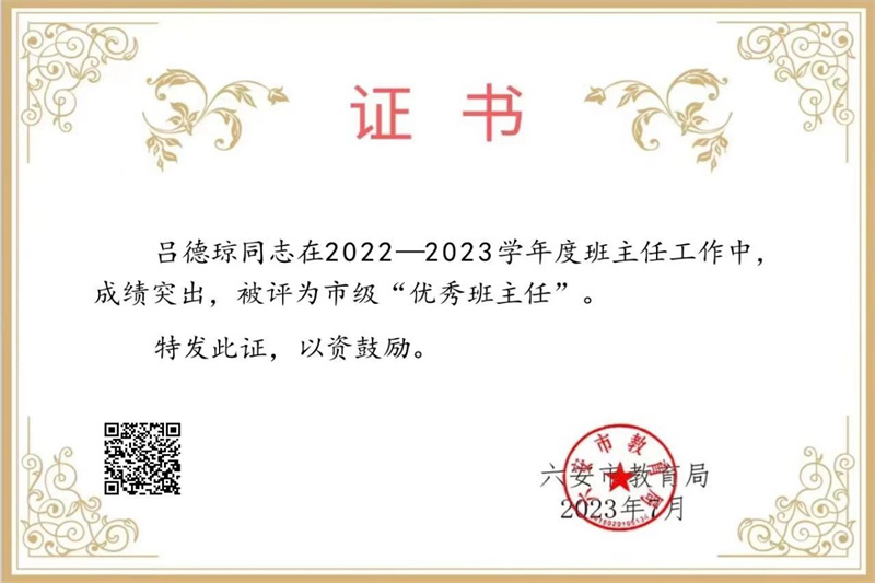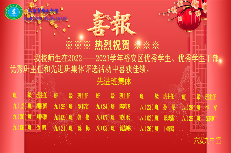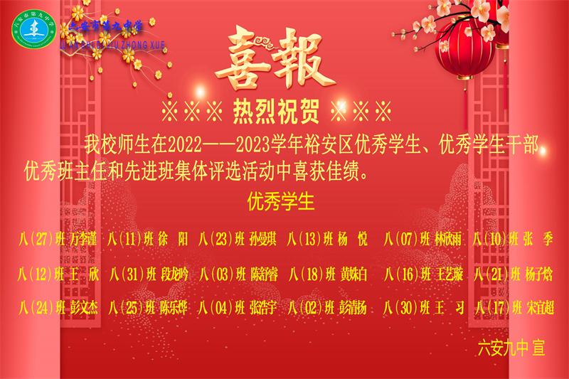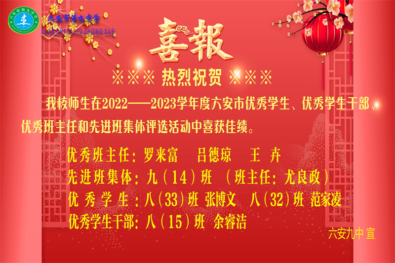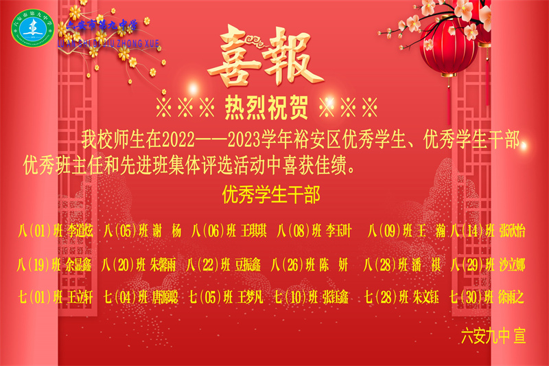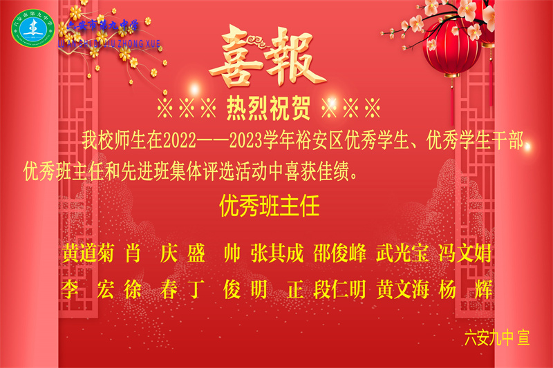 今夏热度攀升,我校捷报频传。继我校在今年中考中创造辉煌成绩之后,在近日公布的六安市、裕安区2022-2023学年度优秀学生、优秀学生干部、优秀班主任和先进班集体评选结果中,我校70余名师生荣获市、区级优秀班主任和优秀学生等荣誉称号。