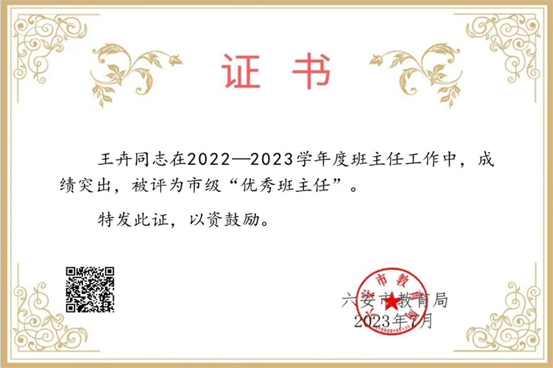 其中,罗来富、吕德琼、王卉三位老师被评为六安市“优秀班主任”,尤良政老师所带的九(14)班被评为六安市“先进班集体”,八(32)班范家凌同学、八(33)班张博文同学荣获六安市“优秀学生”称号,八(15)班余睿洁同学荣获六安市“优秀学生干部”荣誉称号。