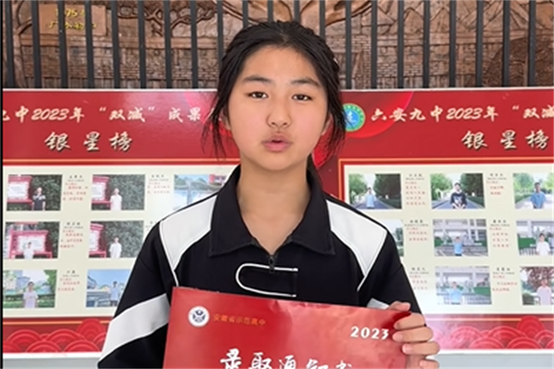 优秀毕业生代表黄依一同学感恩母校和老师们,她说,母校是我们三年成长的地方,感谢老师的辛勤培育,感谢母校三年来,带给我的无限快乐,永远忘不了您,我的母校六安九中。
