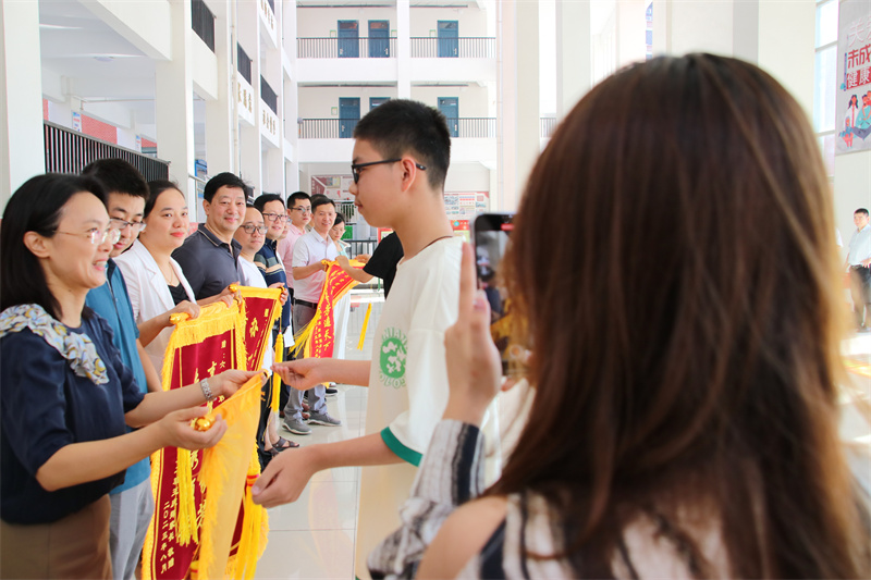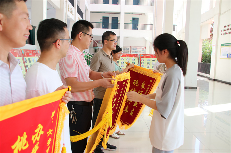 三载辛勤耕耘,换得桃李芬芳。火热的骄阳、难耐的酷热,却抵挡不住学子和家长的感恩之情。8月3日上午,六安九中2023届家长委员会代表及部分学生家长向学校及老师们献上锦旗,以此表达对学校和老师们无私奉献的感激和信任。六安九中校长李艳携毕业班班主任代表接受锦旗,并与家长和同学们进行了亲切的交流。