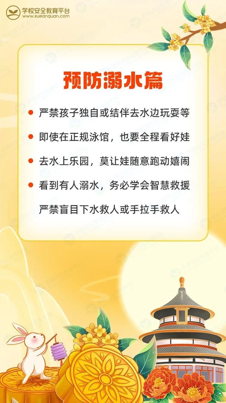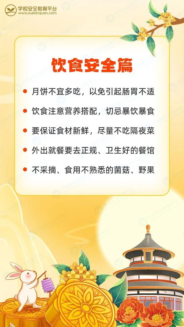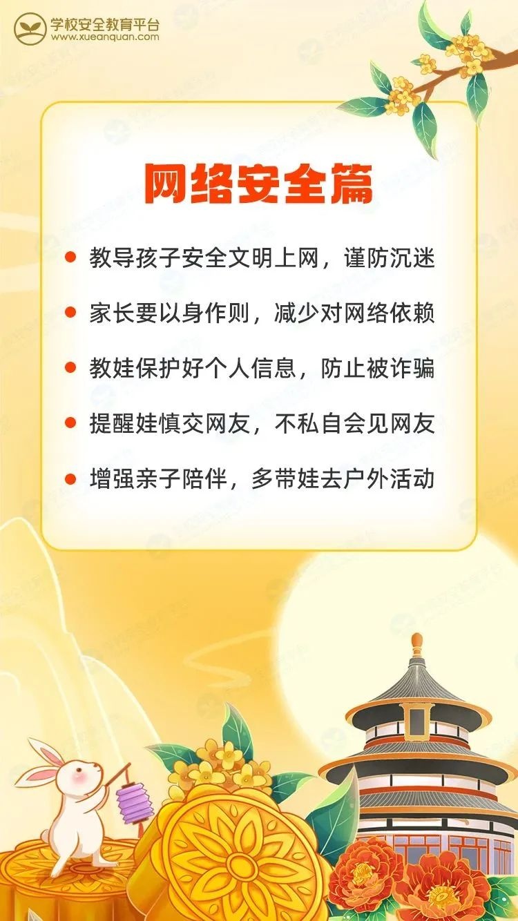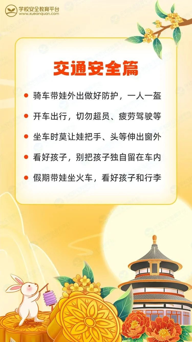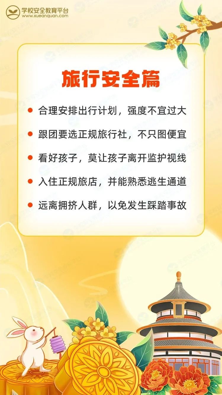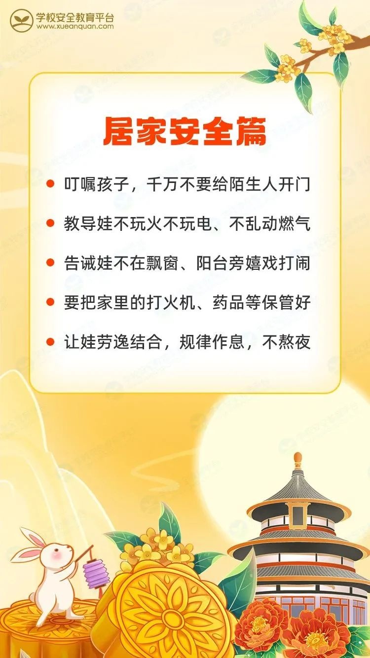 祖国诞辰耀神州,中秋佳节照团圆。亲爱的家长朋友们,让我们合力筑牢校园安全防线,全力护航孩子平安成长。最后,衷心祝愿您和您的家人双节快乐,家庭美满,万事如意!