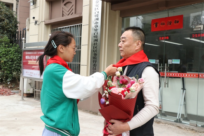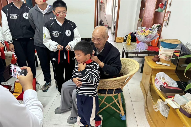 接着少先队员代表为张爷爷敬献红领巾鲜花和节日慰问品。