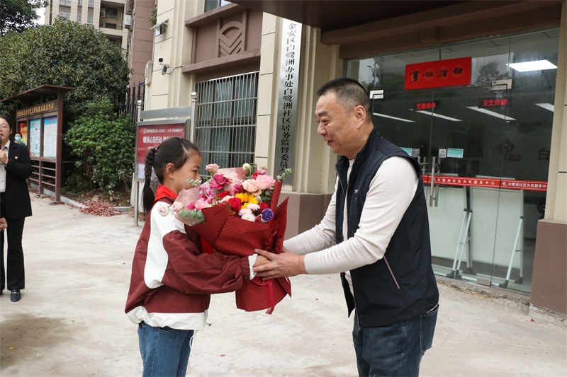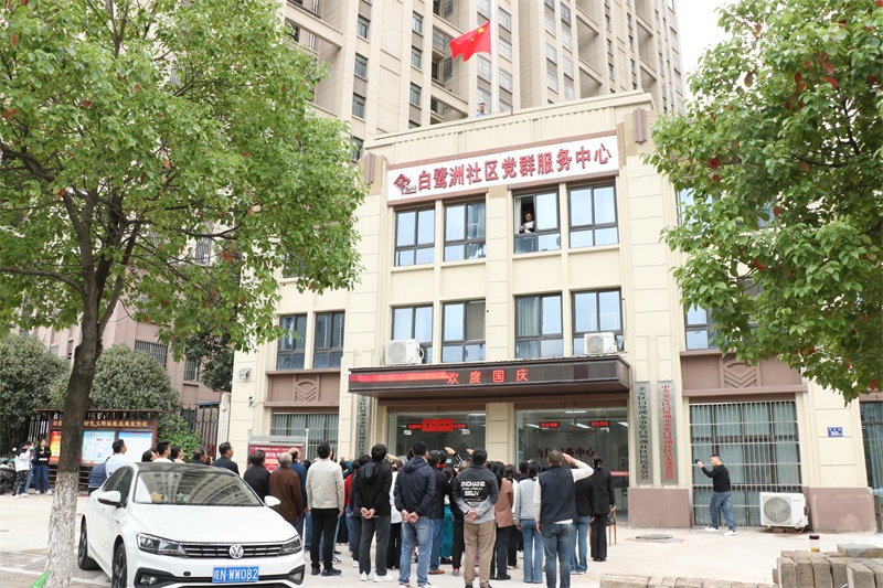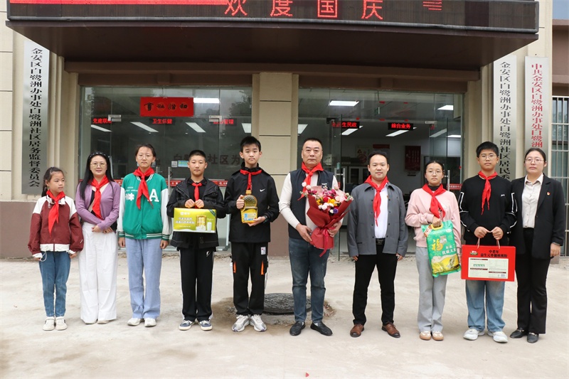 早晨8点,校团委书记明正带领少先队员代表到达张祖庆爷爷所在的白鹭洲社区,随后在社区党群服务中心广场举行了庄严的升旗仪式,共同庆祝新中国75周年华诞。
