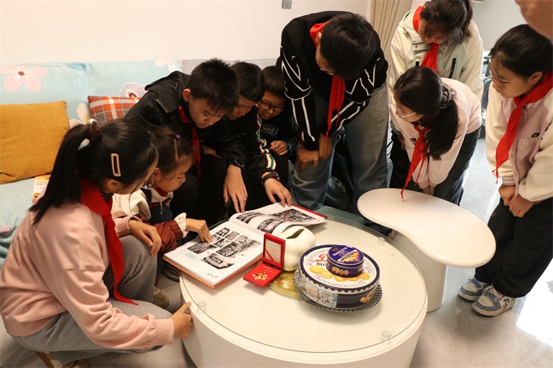 随后,沈爷爷向孩子们展示了自己从战争中所获得功勋,孩子们面色庄严的观看这位老英雄的荣耀。