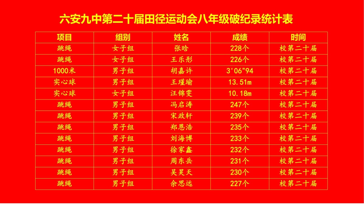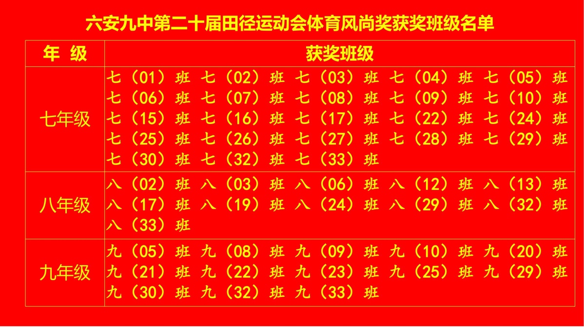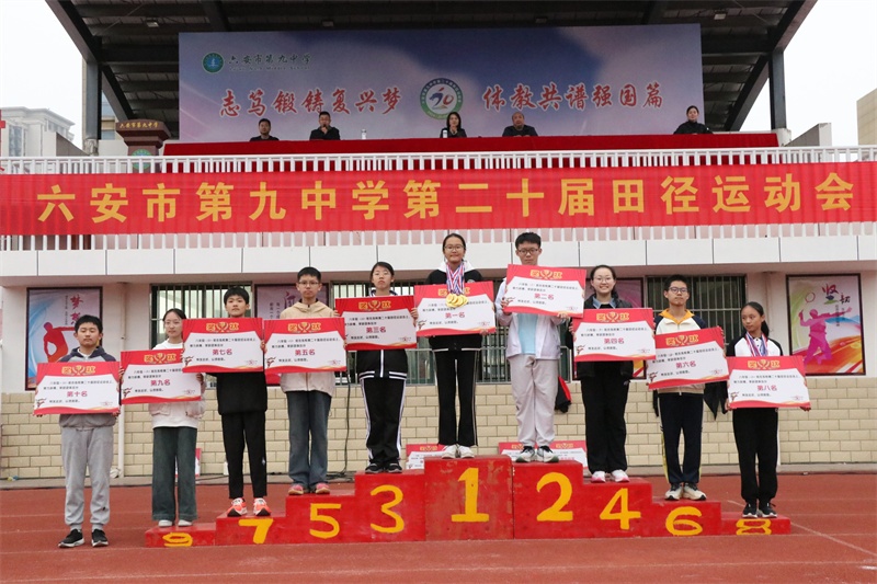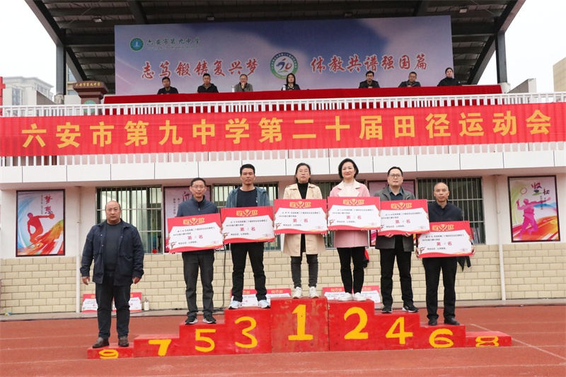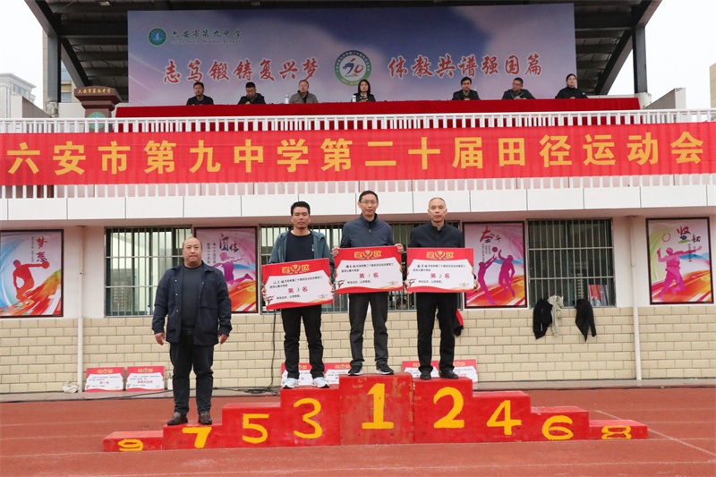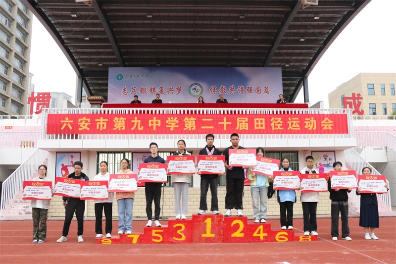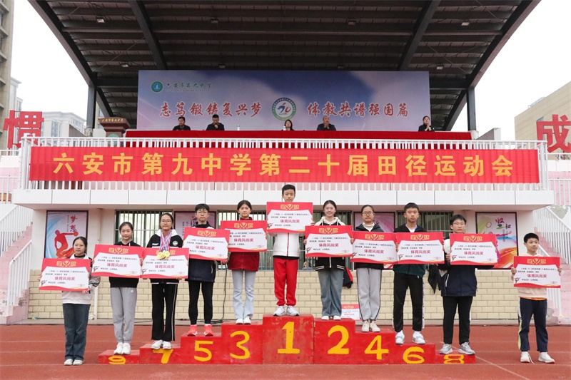 闭幕式上,副书记霍朝晖致闭幕词,总裁判长彭春兰宣读了荣获团体总分奖的班级名单,副校长荣光林、工会主席杨辉分别宣读了荣获体育风尚奖的班级名单和教职工比赛成绩及获奖教研组名单,学校党委书记李艳宣布六安九中第二十届体育文化节暨田径运动会胜利闭幕。