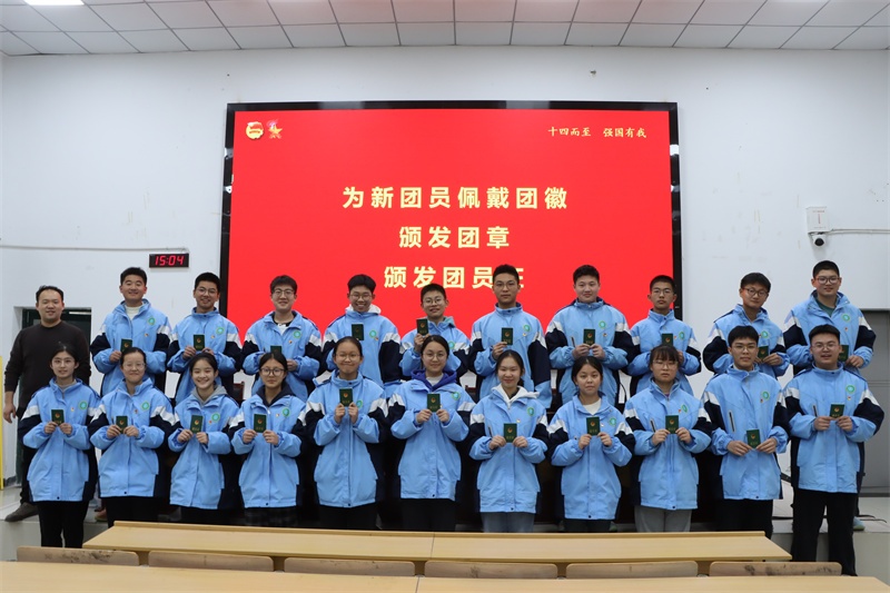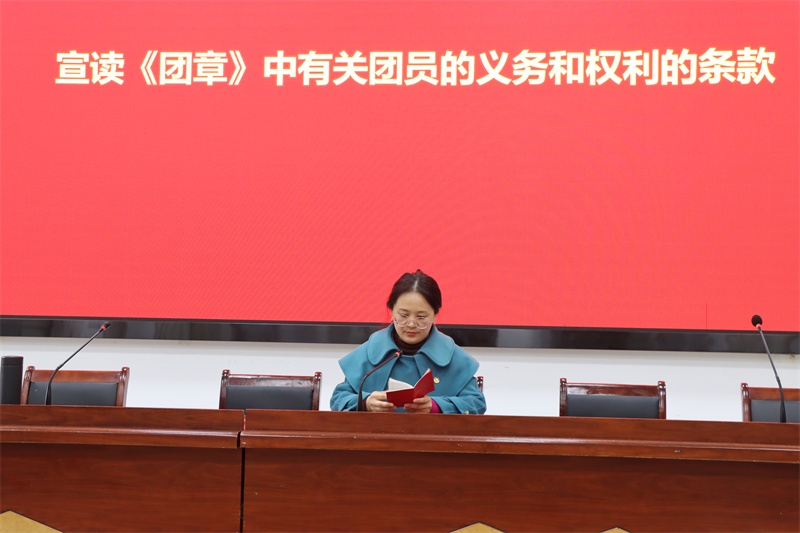 在校团委委员毛云飞老师领誓下,团员们高举右拳,面向团旗,庄严宣誓:“我志愿加入中国共产主义青年团,坚决拥护中国共产党的领导,遵守团的章程,执行团的决议,履行团员义务,严守团的纪律,勤奋学习,积极工作,吃苦在前,享受在后,为共产主义事业而奋斗!”