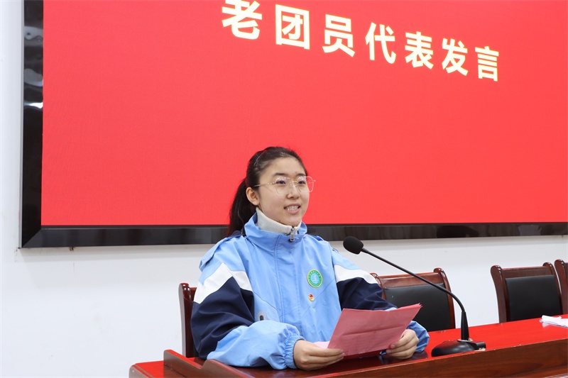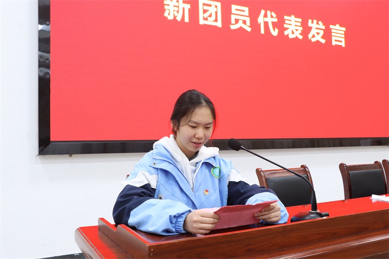九(17)班的周可欣同学代表新团员发言。她分享了对中国共产主义青年团的理解,号召全体团员以更加严格的标准的要求自己,以更加饱满的热情投入到学习中,学先锋榜样,向优秀看齐,在进步的道路上不断前行。九(18)班的司晓涵同学代表老团员发言。她表示加入团组织不仅是一份荣誉与肯定,更意味着责任与担当,并勉励各位团员要不断提高综合素质和能力水平,积极主动地参与各项活动和工作,为团组织的发展贡献青春力量。