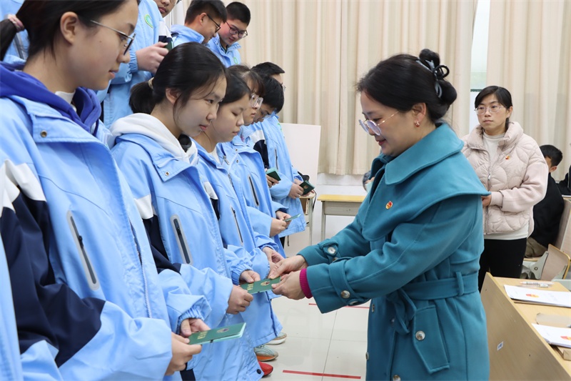 校团委委员为新团员颁发团徽,并同老团员一起为他们佩戴团徽。