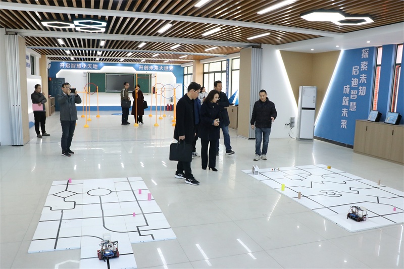 座谈会上,考察组一行听取了我校关于科技创新教育以及“小平科技创新实验室”的创建和运行情况的汇报。我校于2021年成功申报“小平科技创新实验室”,是六安市唯一一所成功申报“小平科技创新实验室”的初中学校。学校已投资建成面积约180多平方米,融合机器人、无人机、计算机编程的“创客”教室,配备了计算机、编程软件、电子制作工具等先进的软硬件设备,为学生探索和实践科技创新搭建一个广阔的科技平台。自贯彻落实“双减”政策以来,我校积极拓宽课后服务内容,开展了丰富多彩的科创社团活动,先后成立了无人机社团、机器人社团和计算机编程社团,主要教学软件编程、电子硬件、传感器入门教学、机器人综合应用等课程。近年来,我校依托“小平科技创新实验室”,辅导并组织学生积极参加国家级、省级智能机器人、无人机、编程等科技创新类比赛。“小平科技创新实验室”学员先后荣获团体国家级奖项5项、省级奖项7项,个人国家级奖15人次、省级奖52人次;省级优秀指导老师6人。在第五届安徽省青少年机器人普及赛上,我校代表队夺得其中两个赛项的一个一等奖和两个三等奖;第八届全国无人机大赛“魁地奇”无人机足球赛中,我校两支队伍分别夺得冠军和季军;在刚刚结束的世界机器人大赛ICode太空探险挑战赛项安徽省选拔赛上,我校七(12)班齐昕翔同学夺得冠军,直接晋级全国总决赛……