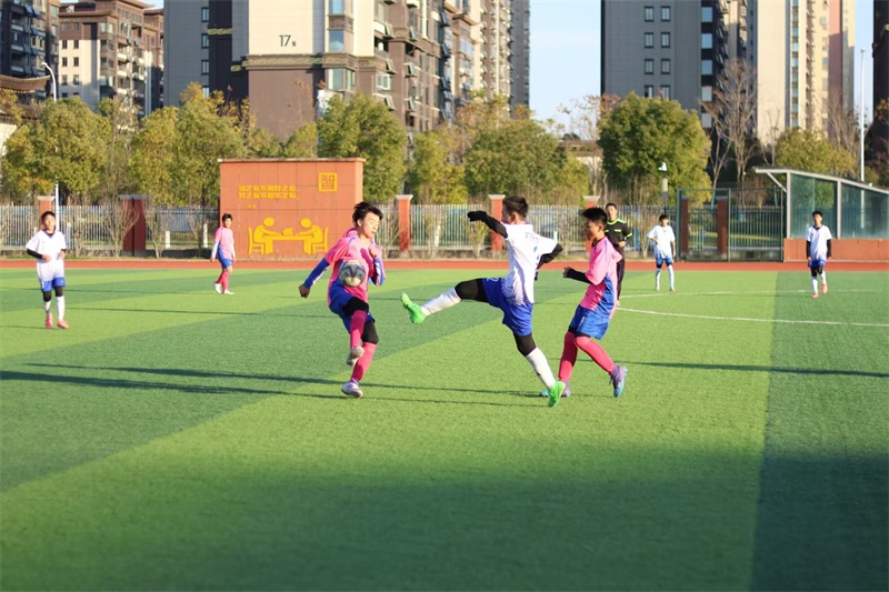因为有球队弃权,原本单循环的赛制变成了更为紧张、刺激的单场“冠军”赛。比赛对手裕安中学队实力不容小觑,阵中几名“老队员”曾多次代表裕安区参加市级大赛。赛前,足球社团老师们严格选拔队员,积极进行训练,不停地分析、研究对手,制定比赛战略、战术;比赛中,九中姑娘们不畏严寒,精神抖擞,她们沉着冷静,积极奔跑,依靠娴熟的个人技术和默契的团队配合将对手牢牢地压制在半场。最终,九中姑娘们用一场6:0的大胜完美夺冠。