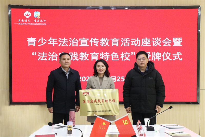 12月25日下午,安徽省青少年法治宣传教育活动座谈会暨全国“法治实践教育特色校”授牌仪式在我校举行。我校被授予“全国法治实践教育特色校”荣誉称号。安徽省青少年法治宣传教育活动办主任沈健、副主任黄薇、工作人员孙超,区关工委主任栾昌荣、副主任石磊,区青少年法治宣传教育活动办主任、区教体局关工委主任张家鼐等领导出席活动。我校党委书记李艳热情接待了沈健一行,并代表学校接受授牌。