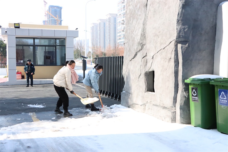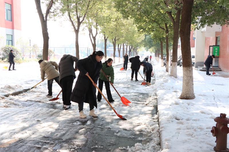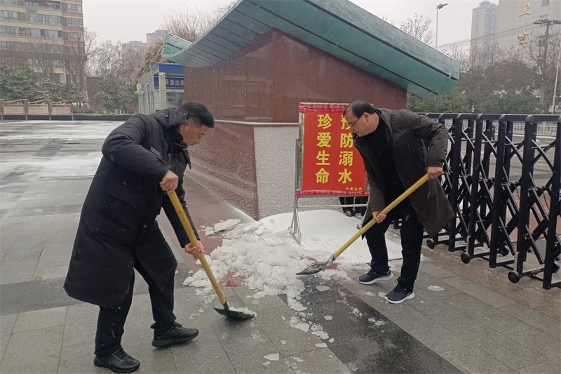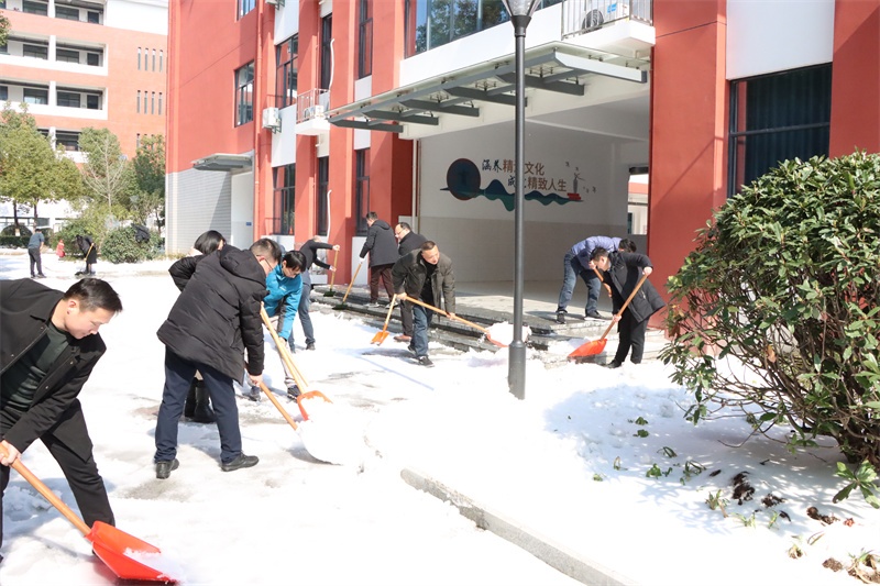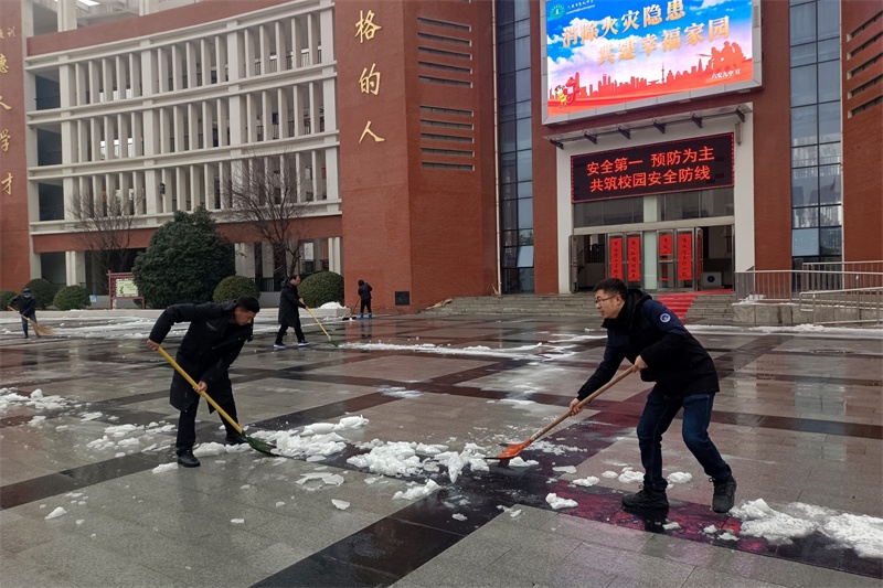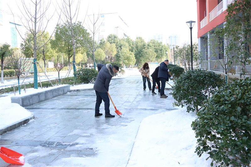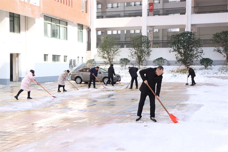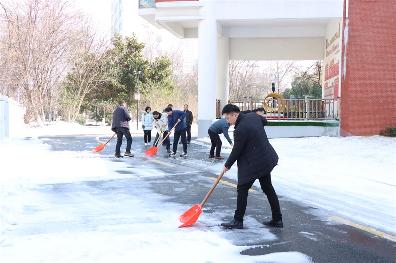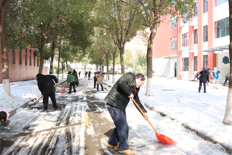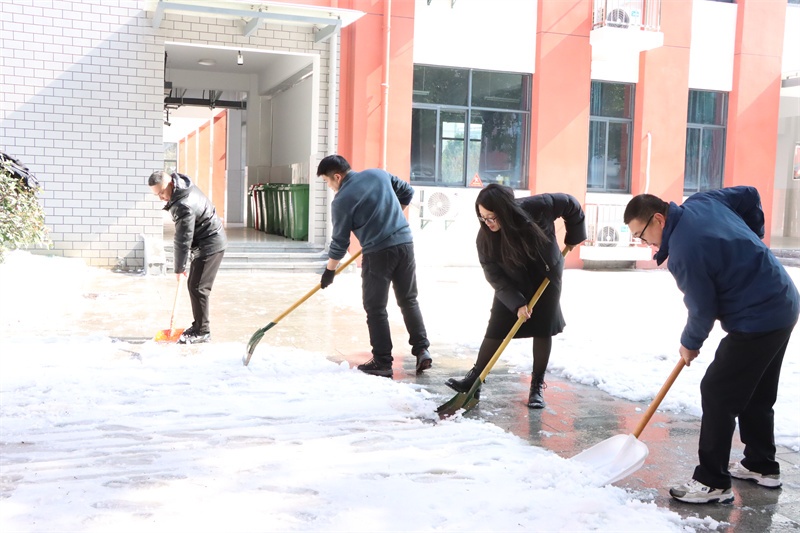 在校园的各个角落,党员老师们纷纷拿起除雪工具,积极迅速投入到铲雪除冰行动中,他们弓着身子,抡起铁锹,挥动扫帚……对校园主干道、教学楼、广场、食堂等学生活动场所的积雪进行全面清扫。老师们铲的铲,推的推,扫的扫,忙碌的身影在皑皑白雪中构成了一道亮丽的风景,各种除雪工具与积雪冰层的碰撞声奏响了一曲最美的除雪“战歌”。经过3个多小时的浴“雪”奋战,铲雪除冰行动成效显著,学校道路、教学楼连廊等区域的积雪冰层被清理干净,地面变得整洁易行,校园道路畅通无阻,为全体师生返校提供了强有力的安全保障。