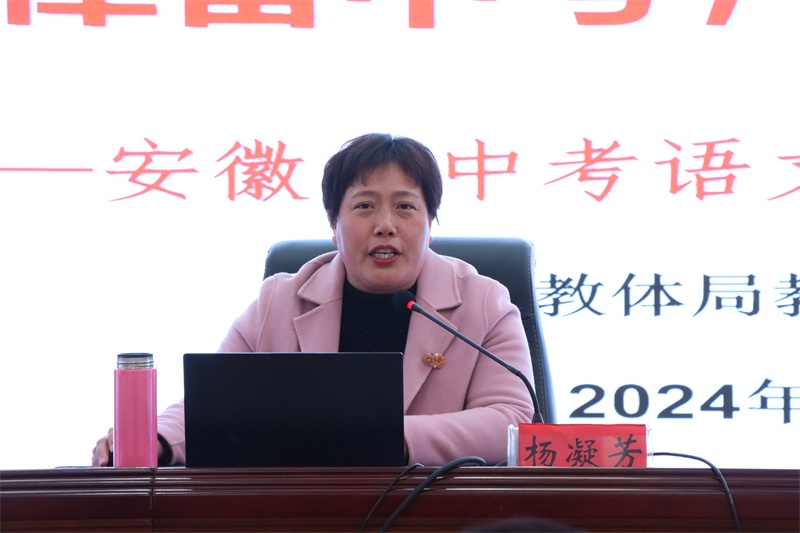 3月11日下午,来自合肥包河区教体局教研室的杨凝芳老师为我区教师作了题为《把握规律备中考,立根素养巧点拨》的报告,就安徽省中考语文命题特色与复习对策进行了深入剖析。杨凝芳老师是安徽省第三届教坛新星,合肥市语文学科带头人,合肥市初中语文名师工作室领衔人,教学经验丰富。