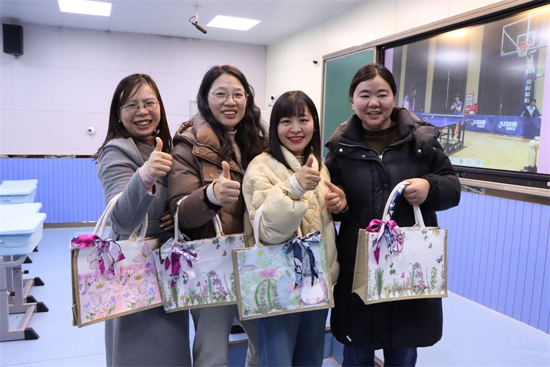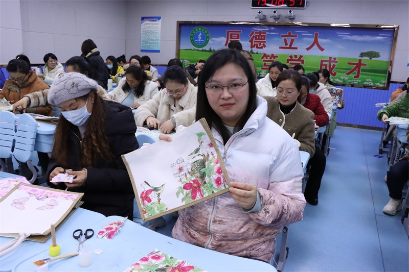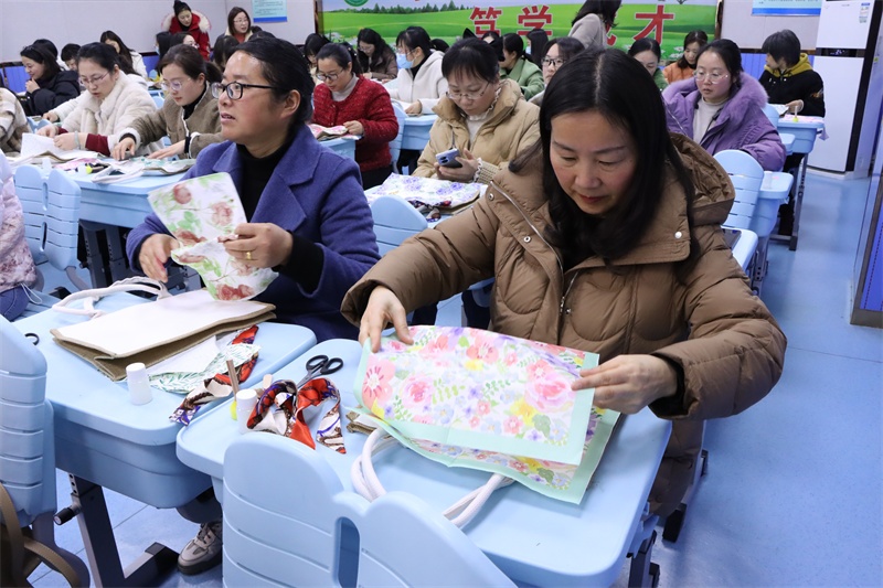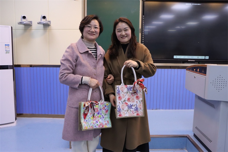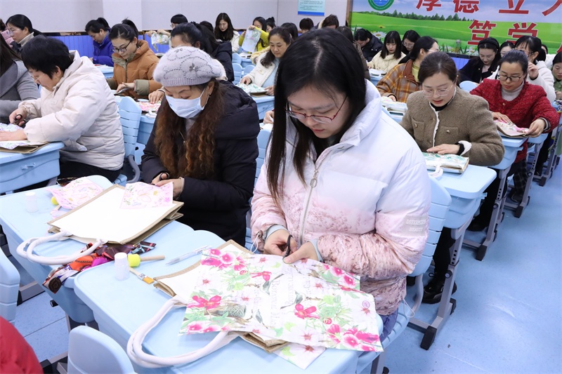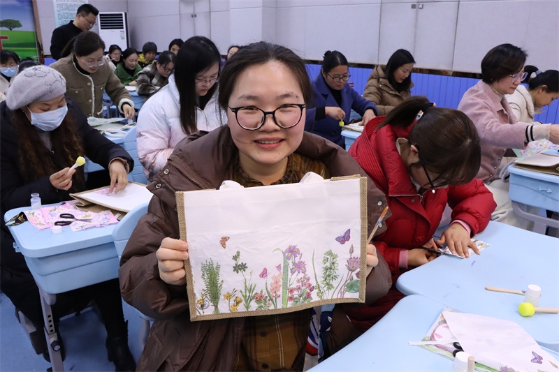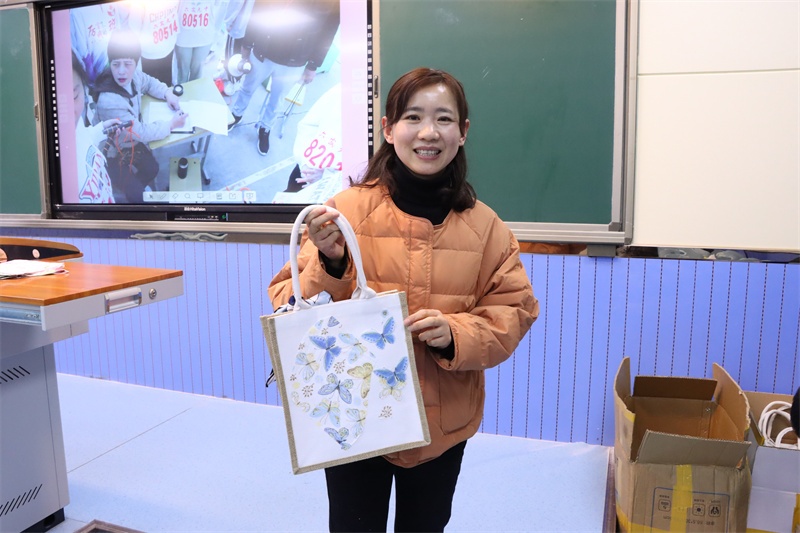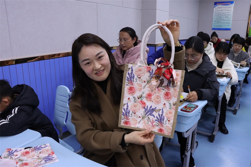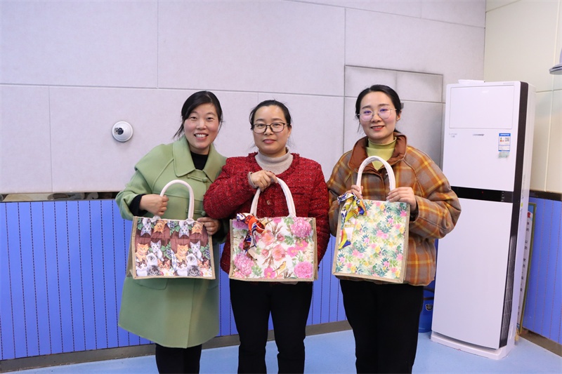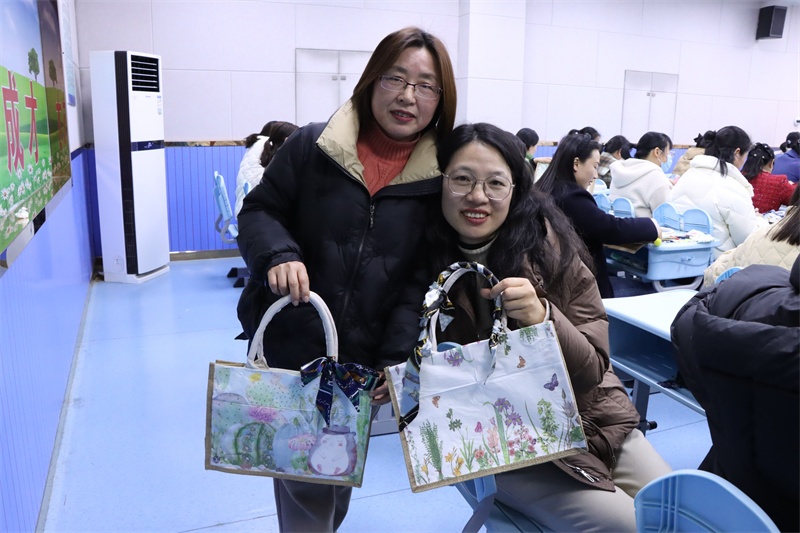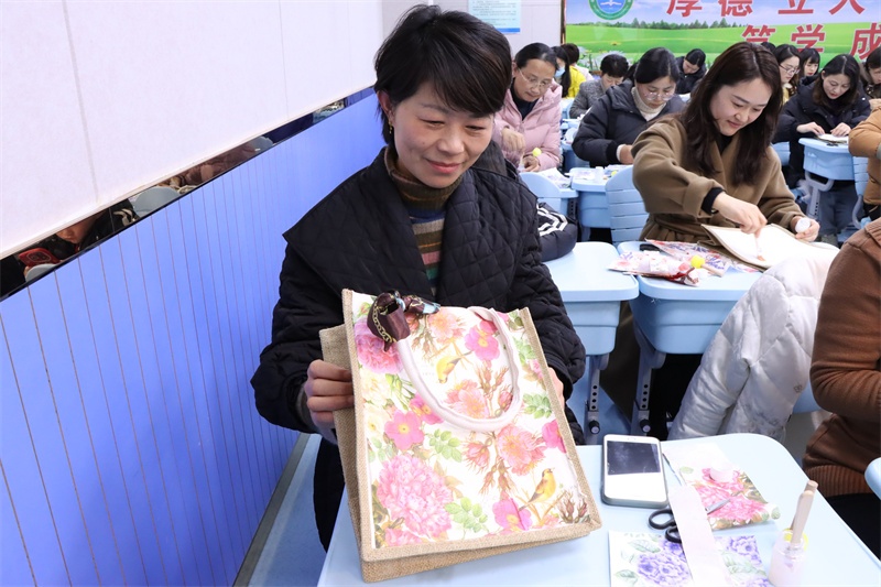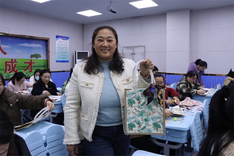 经过一个多小时的精心制作,一个个风格迥异的自制手提包陆续在大家手中诞生,蝶古巴特专用纸在她们的巧手下被赋予了生命和灵气,有的展现出田园风光的清雅,有的散发着俏皮可爱的气息,有的呈现出复古摩登的风格……令人赞叹不已,爱不释手。每一只亲手制作的手提包都是精品,都是艺术品,简单而漂亮,融合着快乐、努力和个人喜好,是为自己送上的一份最美的节日礼物,凝聚着我校女教师对美好的追求和生活的热爱。在欢声笑语中,女教师们互相拍照留念,欣赏着自己亲手制作的、精美的包包,享受着DIY带来的乐趣,幸福的笑容绽放在脸上……