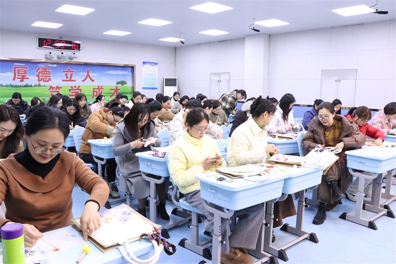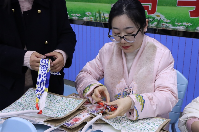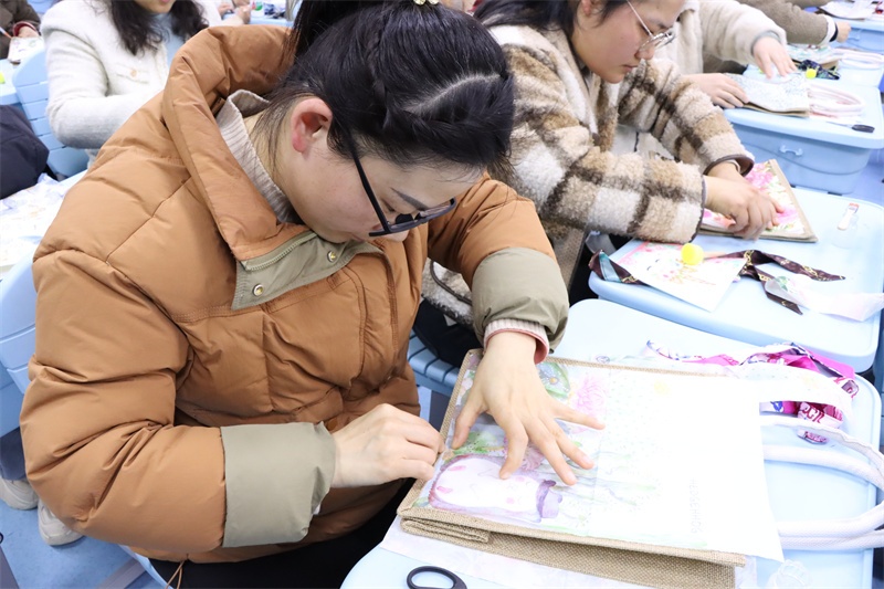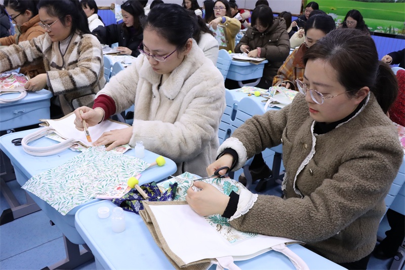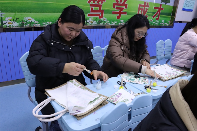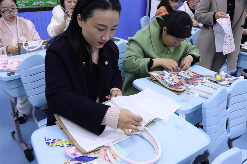 当“女神”遇上创意,当帆布包遇上图案,人人都是艺术家。在制作过程中,女教师们兴致勃勃地创作着属于自己独一无二的手提包,充分展现出自己的创造力和艺术品位。活动中,女教师们共同探讨,协同制作,按照步骤,进行剪画、贴画、刷胶、按压……每一步的操作都细致认真,力求完美,巧妙地将鲜艳的颜色运用在布料上,融入精心设计的艺术元素,沉浸在无限的想象与创意中。