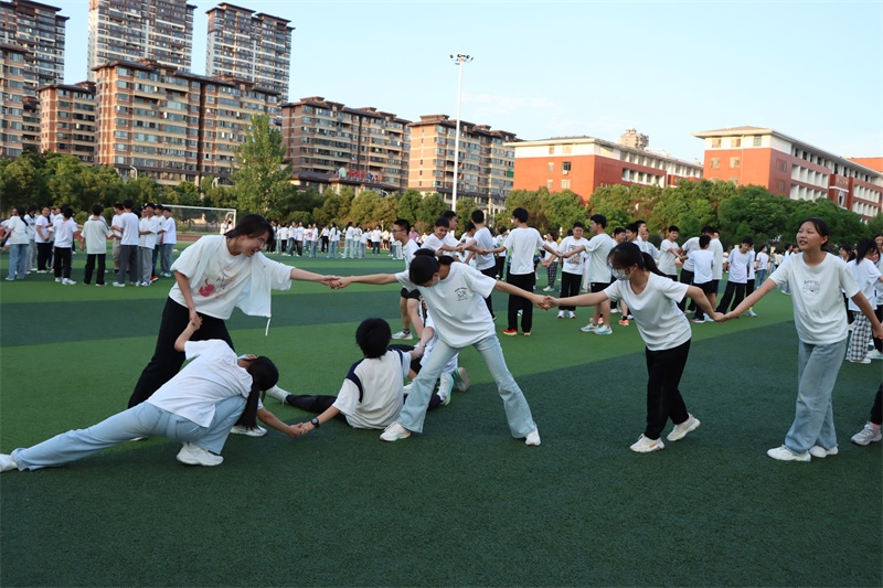 “心有千千结”的团体心理游戏活动,旨在让同学们体验到团队合作的真谛和力量,享受团体合作的快乐,体会在人际交往中沟通、谦让和信任的重要性。活动前,学生们分别记住自己左右边同学,然后再跟着音乐随意舞动,音乐停时,请寻找并拉住自己原来左右边的同学,如此便形成“结”。最后,在不说话不松手的情况下,想办法打开这个“结”。活动中,学生切身感悟到,“心”有千千“结”,也有千千解。真正的“结”其实在每个人心中,只要下定决心解开心结,就一定能够达到目标;每个人都是重要的,只有每个人都努力去做,才能有效把结解开;解开“结”的方法有很多种,每个人都是突破口,需要我们转变思维,换位思考。在有趣的游戏互动中,在阵阵的欢声笑语中,同学们释放了压力,放松了心情,收获了成长。