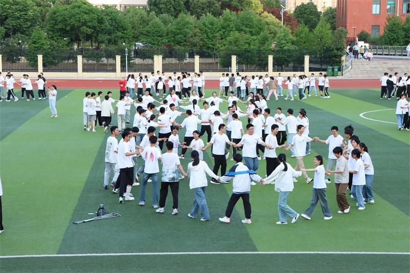 为打破学生的心理防御,活动伊始,进行热身游戏——“小蜜蜂”。每个班级站成3个大圈,同学们把大拇指放在另一位同学的手掌下,顺时针转起来,听指令,抓住对方手指。在活泼的音乐和笑声中,同学们不知不觉地消除了紧张感,放松了身心,拉近了心与心的距离,主动地投入到接下来的活动中。