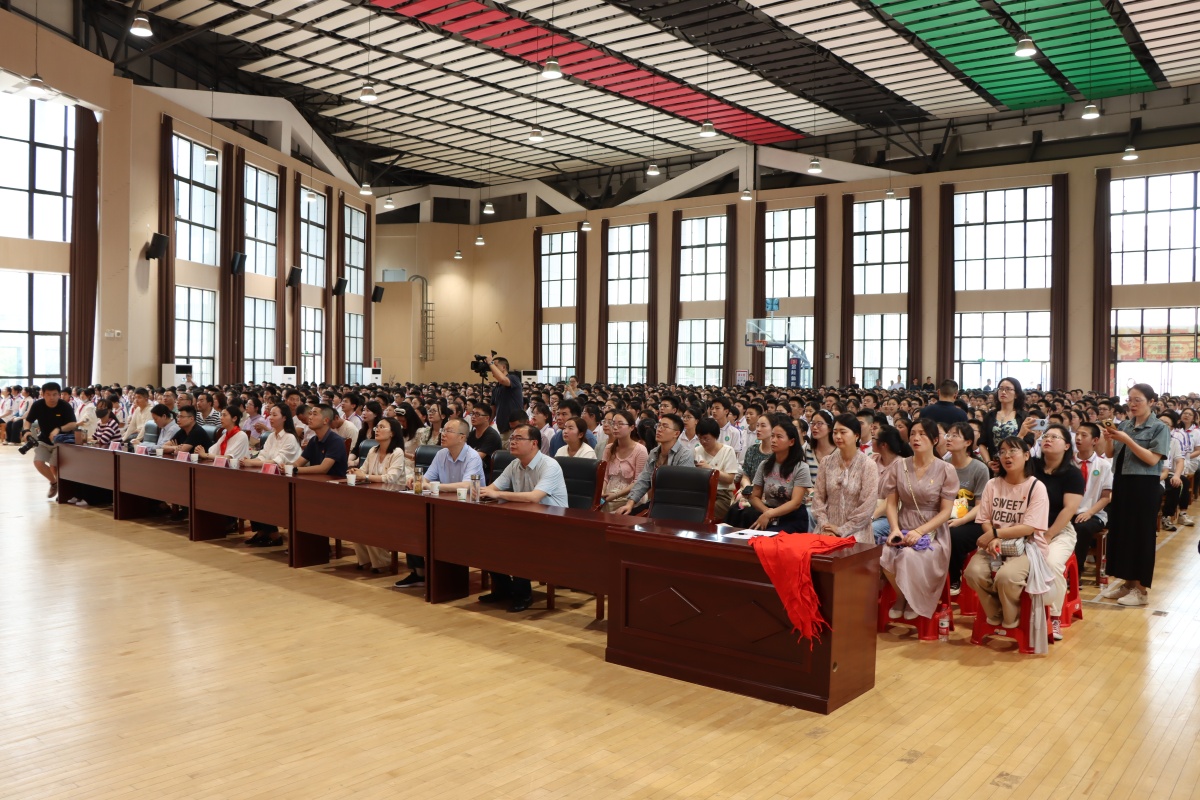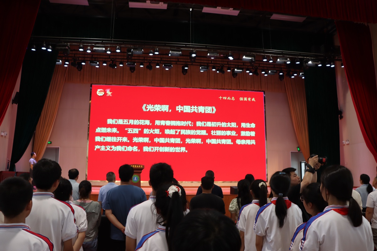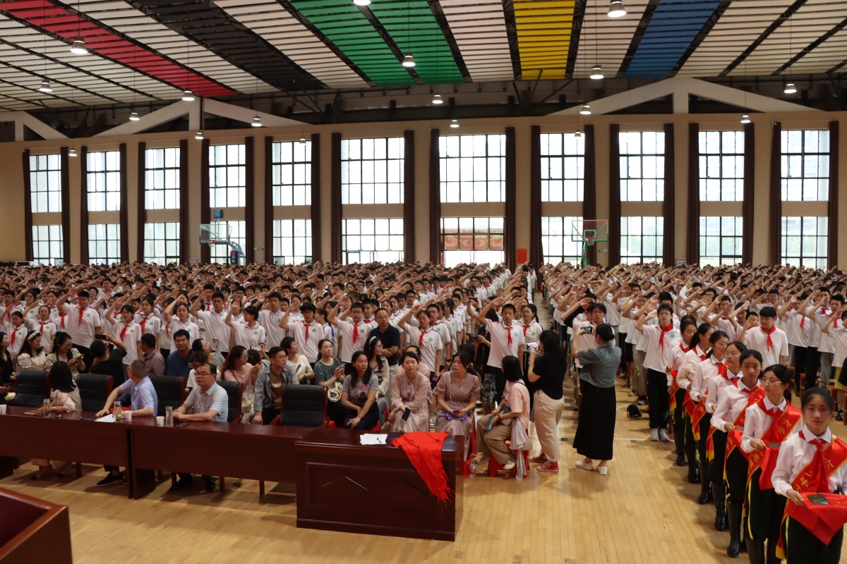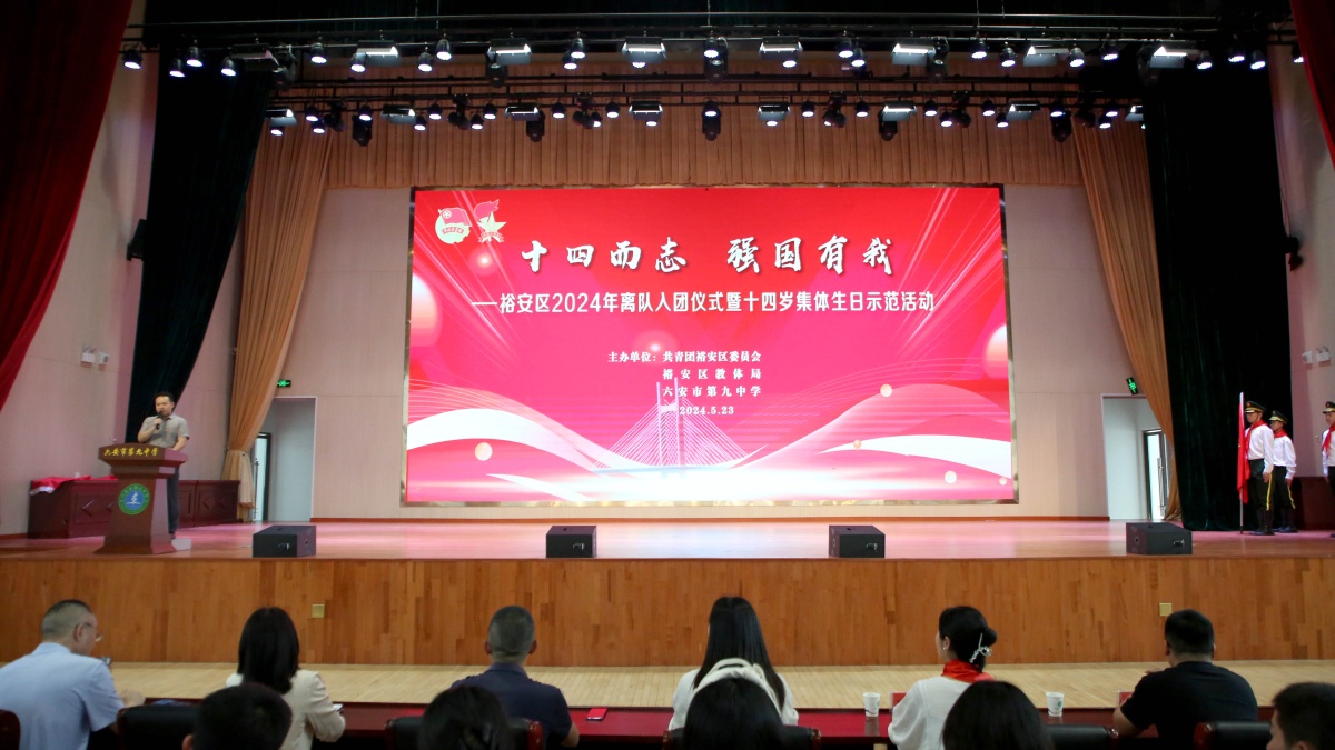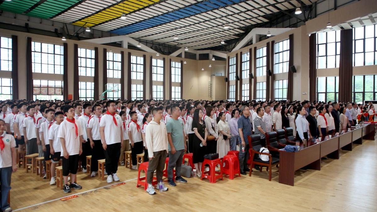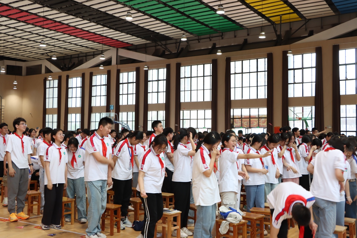 离队感恩春晖暖,入团奋飞天地宽。为贯彻习近平总书记对共青团工作的指示精神,落实《中学共青团改革实施方案》总体部署,增强共青团员和少先队员的身份认同感、光荣感和责任感,“六一”儿童节前夕,裕安区2024年离队入团仪式暨十四岁集体生日示范活动在我校艺体馆举行。团区委书记管娇娇、团区委副书记杨锐、区少先队总辅导员陶红梅、团区委学少部部长王丽、区教育团工委副书记乔楠莅临指导,来自全区各初中的团组织负责人应邀出席活动。我校党支部书记、校长李艳,学校领导班子成员,八年级32位中队辅导员及全体八年级近2100名学生参加了活动。