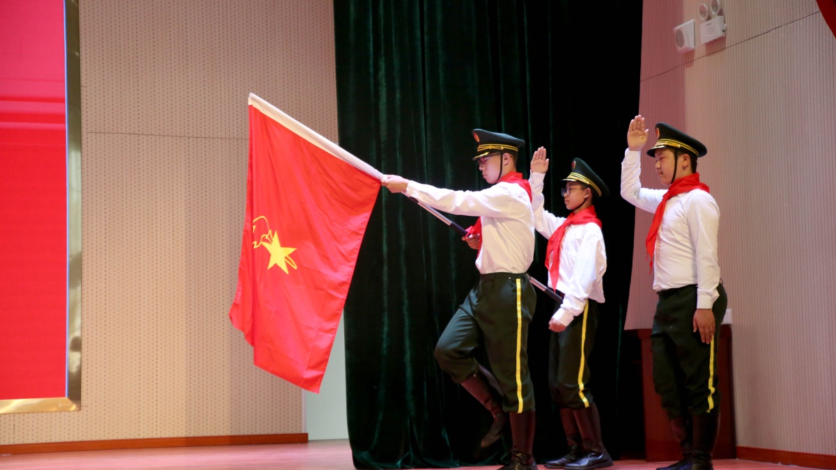 三名少先队员擎起绣着星星火炬的队旗缓缓走来。全场近2100名少先队员注视着陪伴自己一路成长的旗帜,高举右手行礼致敬。“我们是共产主义接班人,继承革命的光荣传统,爱祖国,爱人民……”嘹亮的歌声响起,队员们动情地歌唱着,有许多感激的话语要对少先队组织诉说,有深深的不舍和眷念要对辅导员老师倾诉……
