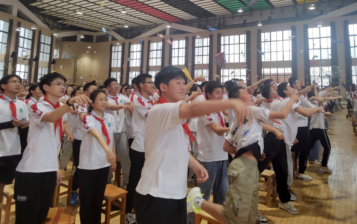 十四岁,是朝气蓬勃的年龄,是从幼稚迈向成熟独立的年龄,也是在法律层面具有标志性的年龄。同学们向队旗敬队礼,把美好的人生理想书写在五彩缤纷的卡片上,折成纸飞机。彩色的纸飞机在空中飞扬,载着青春的梦想,在各自的航道里疾驰,犹如一个个有趣的精灵舞动着精彩的人生。