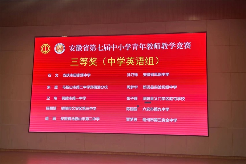 本次竞赛以“上好一门课”为竞赛理念,共设立五个组别,由教学设计、教学展示两部分组成。陈园园老师以市级选拔赛初中英语组第一名的优异成绩代表六安市参加此次省级比赛。赛前,陈园园老师反复研读新课标,精研教材,精心设计教学环节,确保取得良好的教学实效。赛中,她展示所长,授课内容丰富,讲解清晰易懂,运用多种教学方法创设课堂,活跃了课堂氛围。赛后,经评审组对参赛教师的教学理念、教学设计、课堂表现、思维能力、表达能力以及临场应变能力等方面进行的综合点评,最终,我校陈园园老师荣获安徽省第七届中小学青年教师教学竞赛中学英语组三等奖。