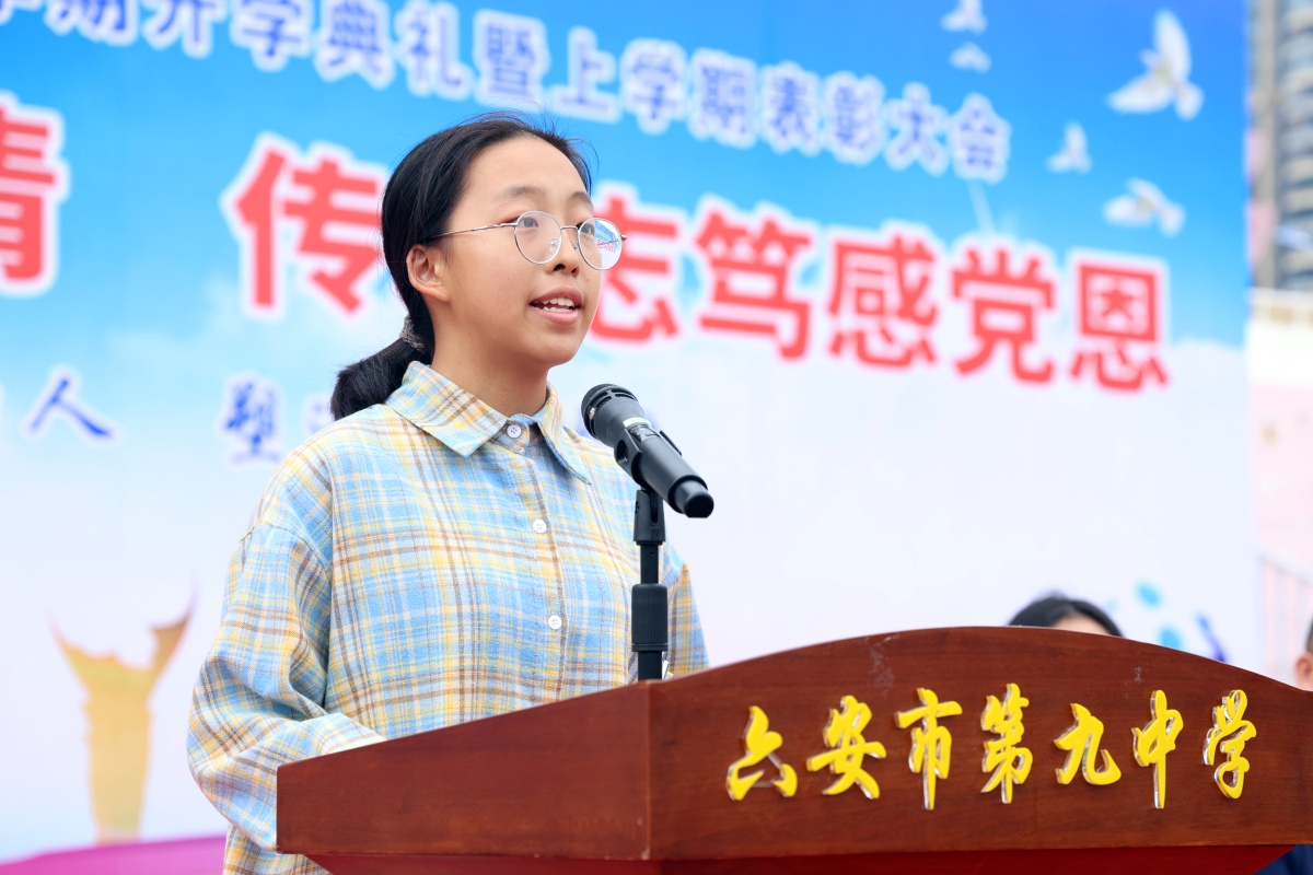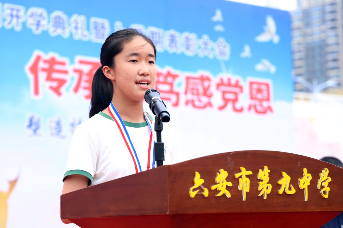 志笃传承朝气满。七(2)班的从可欣同学代表新生在开学典礼上发言。她满怀期盼和向往,选择了来九中就读。半个月的校园生活体验,让她感受到九中优良的校风、严谨的教风和上进的学风,也激励着她将用信仰、勤奋、坚持,在九中跑出最美的人生姿态。