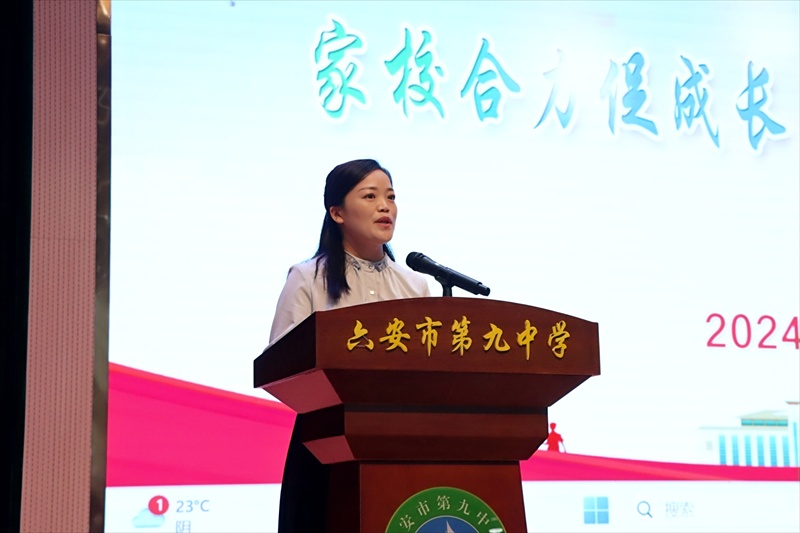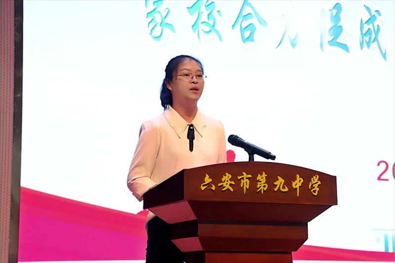 七(16)班林雨霏同学家长、解放路小学少先大队辅导员王学华代表学生家长做了题为《双向奔赴 筑梦未来》的发言。发言中,王学华为孩子在进入大美九中的半个多月的时间内的成长和变化感到欣慰和激动,为孩子在拥有先进办学理念、优质育人环境、优秀教师队伍的六安九中学习感到满足和幸运。她认为,教育孩子,家长责无旁贷;陪伴孩子成长,身教重于言教;并表示积极与学校、老师沟通联系,及时了解孩子的学习情况和行为表现,宽容和理解孩子,相信孩子、相信老师、相信学校,与老师携手共进,形成家校合力,筑梦美好未来。