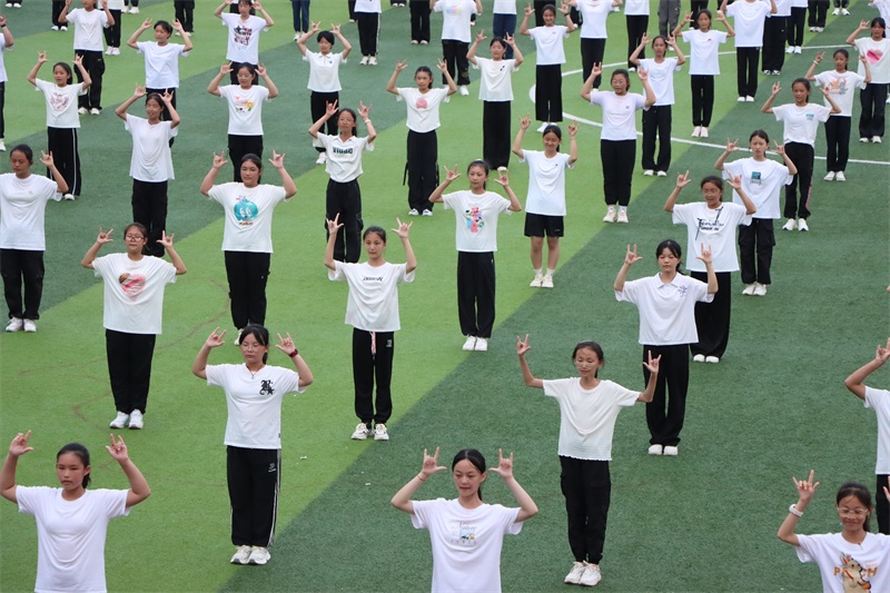 大型手语操《感恩的心》《国家》表演压轴登场,气势恢宏,整齐划一,激荡人心。美而轻快的音乐响起,同学们动作流畅,富有动感,整齐划一,宛如一体,展示出积极向上的青春姿态。