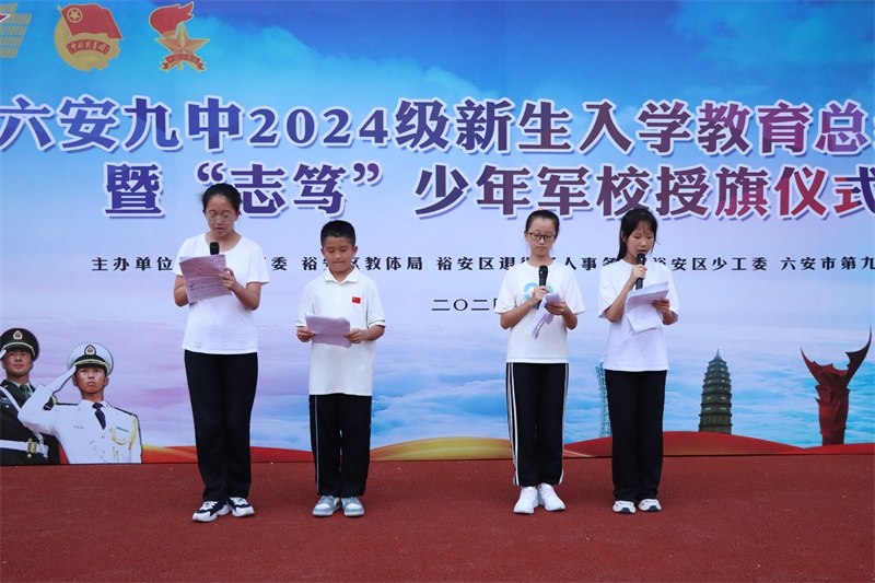六安九中党委书记李艳作总结讲话。李艳向六安九中“志笃”少年军校的正式成立表示热烈祝贺,向2024级新生表示热烈欢迎,充分肯定此次入学教育的意义,高度赞扬同学们在汇报演出中队列整齐、动作规范以及激情昂扬的精神面貌。李艳深情寄语2024级新生,要以这次入学教育为起点,把适应性训练中饱满的热情、顽强的毅力、必胜的信心化成学习的动力、进步的动力,积极主动地投入到充满挑战、磨炼和期待的初中学习和生活中去,努力拼博,奋发进取,传承志笃文化,争做一名笃志、笃学、笃行、笃礼的“志笃”少年,志存高远、博学求知、笃行不怠、崇礼尚德,为实现中华民族伟大复兴而努力读书。