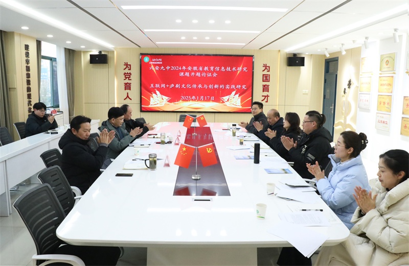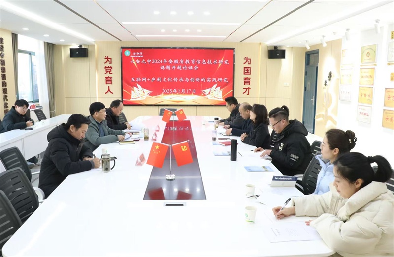 2025年1月17日,六安九中2024安徽省教育信息技术研究课题《互联网+庐剧文化传承与创新的实践研究》开题论证会在我校笃志楼一楼接待室隆重召开。六安市电化教育馆和教师发展中心主任谷炳海、裕安区教育局电教馆馆长肖国安、裕安区教育局教研室副主任王立平、省级非物质文化遗产项目(庐剧)代表性传承人白树龙出席开题论证会。会议由六安九中党委书记李艳主持。分管教研副校长黄文海以及课题组主要成员何映月、袁菲菲、陈海燕与专家组齐聚一堂,共同为课题的研究开启新的征程。