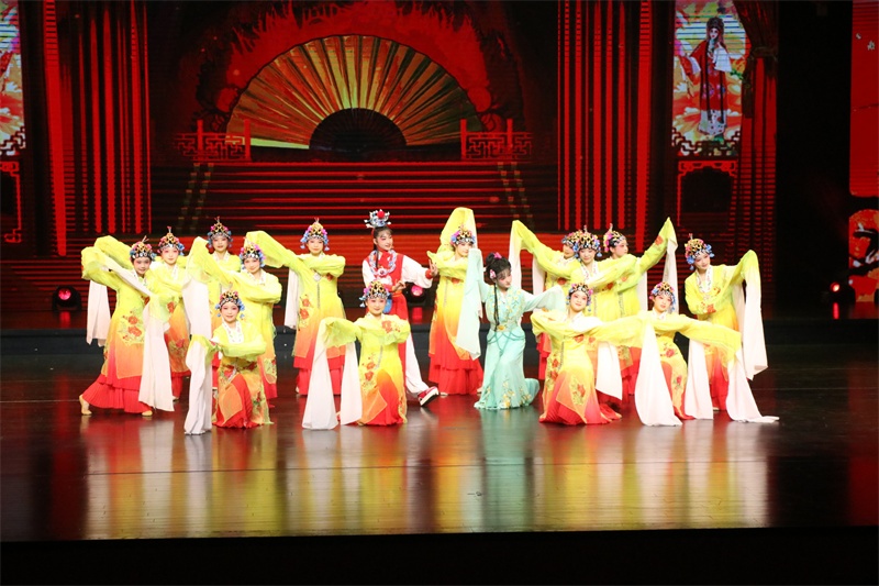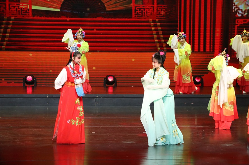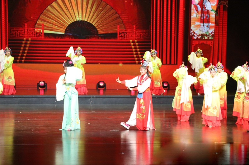 庐剧表演唱《庐韵》曲调幽默风趣,场面热闹喜庆,地方风味浓郁,配以精心制作的背景画面,宛如一幅美丽的画卷。表演中,小演员们长袂飘飘,舞姿婀娜,唱腔老练成熟,演技十分精湛,既有艺术性,又有观赏性,彰显了“志笃少年”的朝气蓬勃、自信飞扬的精神面貌,赢得了全场观众的高度赞赏和阵阵掌声。舞台上,小演员们个个扮相俊俏,形象惟妙惟肖,嗓音纯净清澈,舞姿优美动人,把故事情节和人物情感演绎得淋漓尽致,不仅展示了“志笃少年”们深厚的艺术修养和出色的表演技巧,更展现了我校贯彻“双减”政策、践行“五育并举”、传承传统文化的丰硕成果。