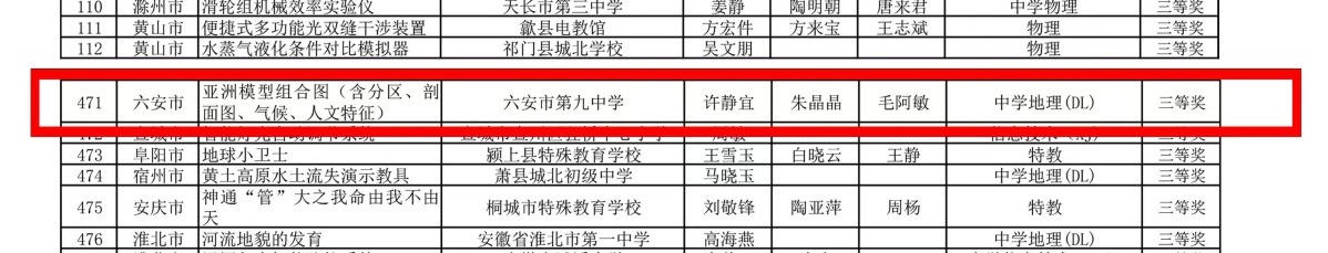 近日,安徽省教育厅公布了2025年安徽省中小学自制教具评选活动的比赛结果,我校地理教研组许静宜、朱晶晶、毛阿敏三位老师合作的作品《亚洲模型组合图(含分区、剖面图、气候、人文特征)》荣获三等奖,展现了我校教师出色的创新与实践能力。