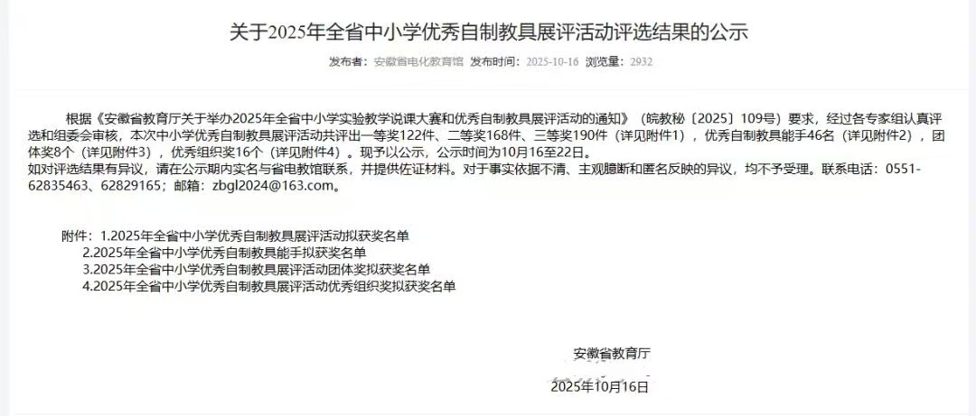 本次全省中小学优秀自制教具展评活动,旨在鼓励教师创新教学手段,提升实践教学能力,参赛作品均代表了各地区最高的教具研发水平。在此次强手如林的竞争中,我校三位老师作品能够脱颖而出,充分彰显了我校教师深厚的专业素养、勇于探索的创新精神和卓越的动手实践能力。