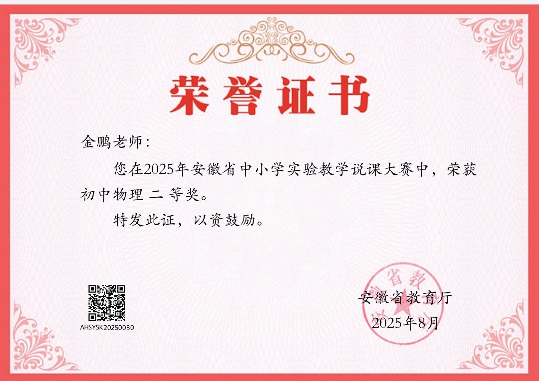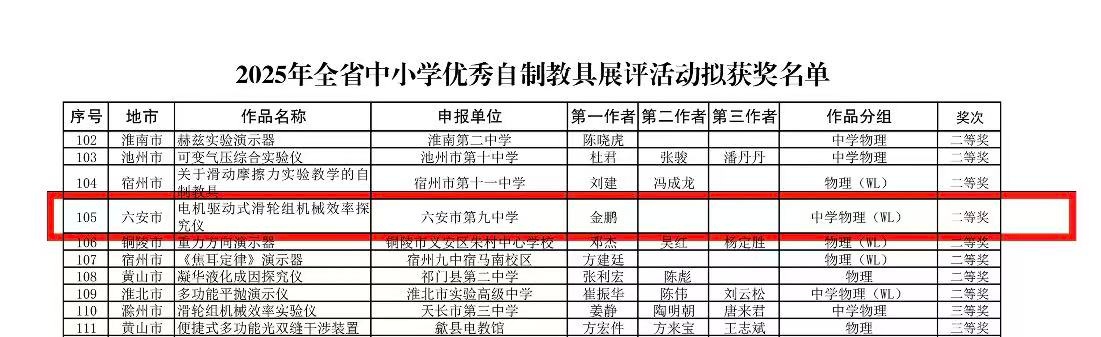 捷报频传,硕果盈枝。近日,我校教师发展再传喜讯:金鹏老师在接连举行的两项省级高水平教学竞赛中表现卓越,先后斩获“安徽省中小学教师说课比赛”省级二等奖与“安徽省优秀教具展评活动”省级二等奖。短短时间内,双喜临门,这不仅是他个人专业能力的精彩绽放,更是我校持续推进教师队伍建设、助力青年教师成长的丰硕成果。