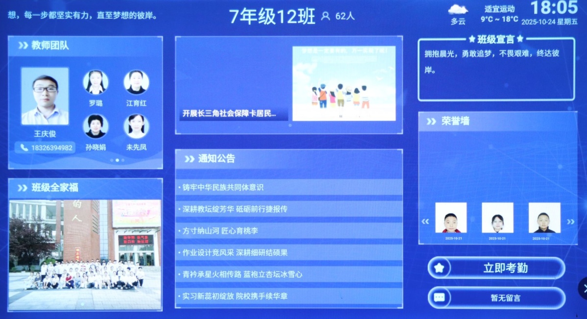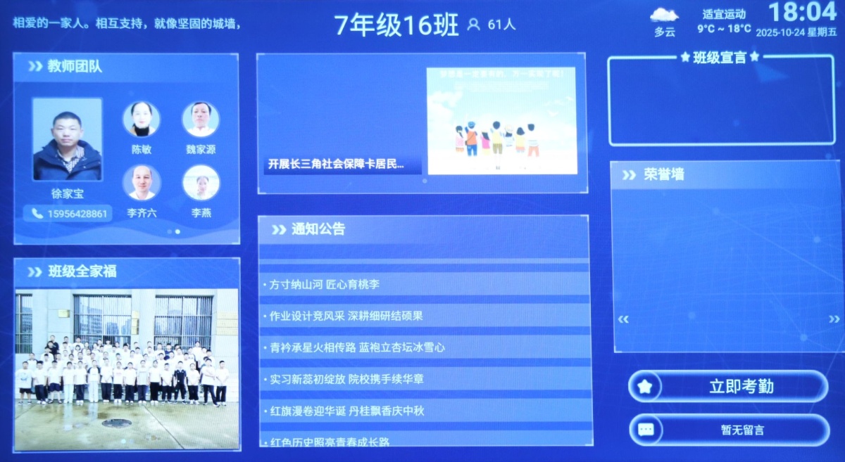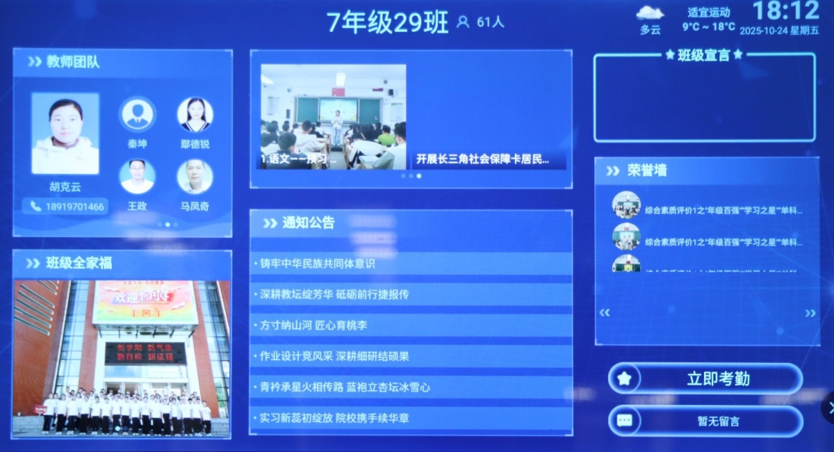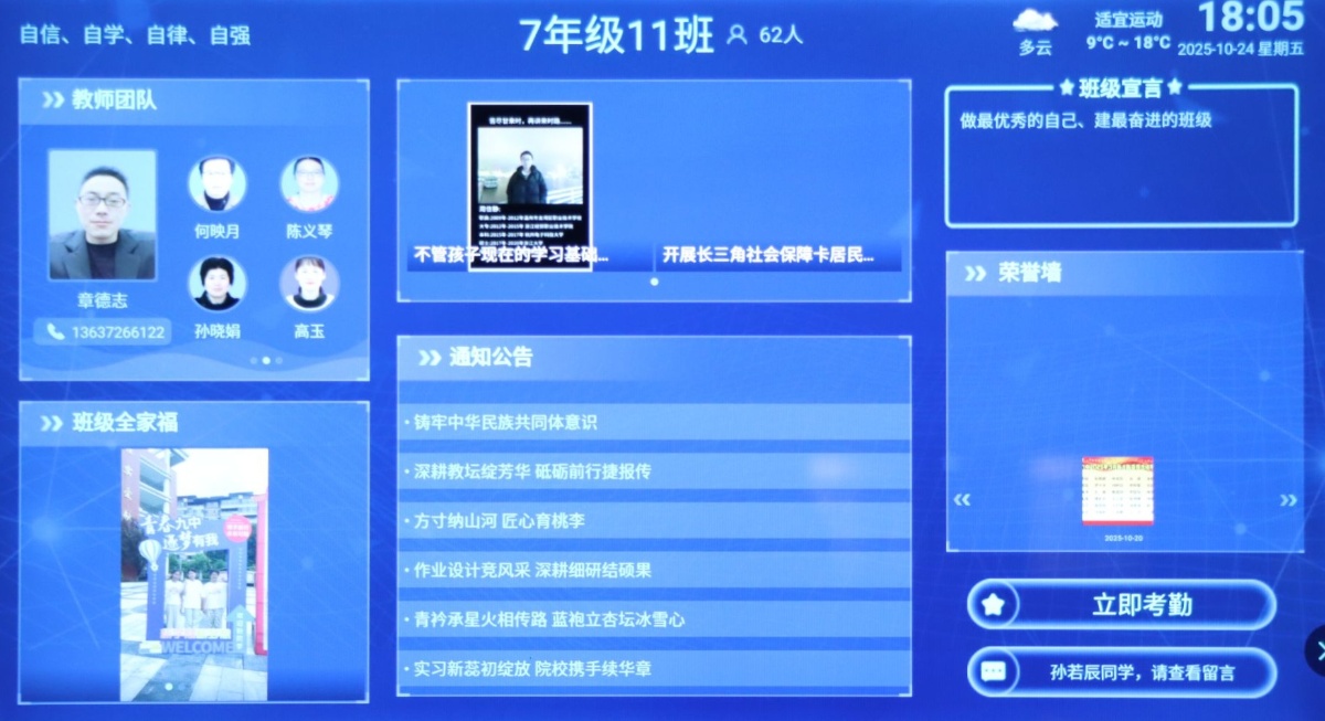 智慧班牌不仅是展现特色班级文化的窗口,更是各班级日常管理的得力助手。智慧班牌的“考勤打卡”功能便捷高效,学生刷脸即可完成考勤,系统实时记录;家长可以通过手机端微信公众号“天云智慧校园”系统,远程查看孩子早、午到校签到时间;班主任查看考勤记录,可以更高效地了解学生出勤状况,进行班级管理。家长还能通过“天云智慧校园”直接给孩子发送留言,学生刷社保卡即可解锁专属留言板,接收、查看并回复留言。“家长留言”功能确保了家长与孩子之间的及时、便捷沟通,实现了家校互通无障碍,助力学校落实“五项管理”,加强手机管理,全面提升育人质量。